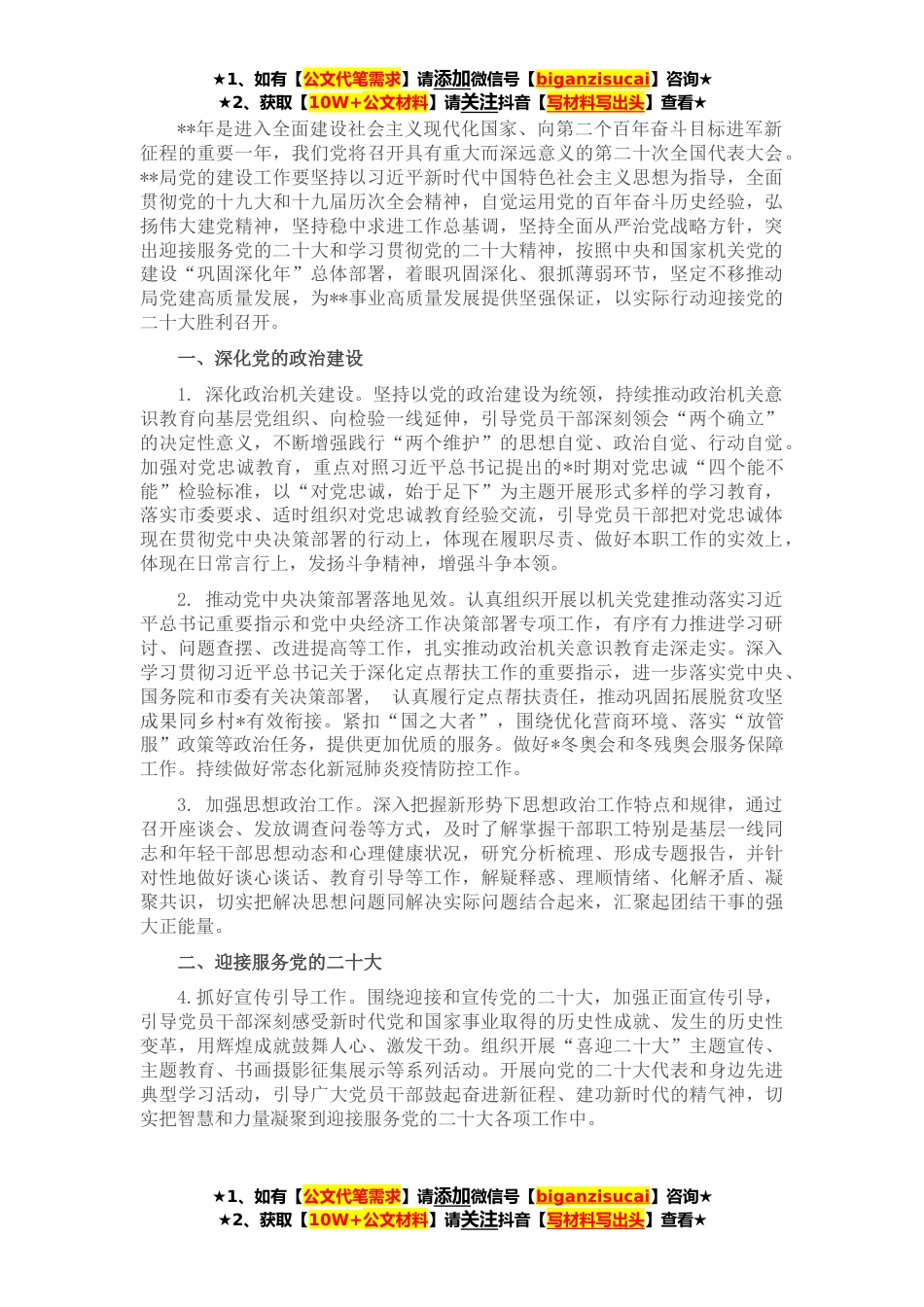 ★1、如有【公文代笔需求】请添加微信号【biganzisucai】咨询★★2、获取【10W+公文材料】请关注抖音【写材料写出头】查看★**年是进入全面建设社会主义现代化国家、向第二个百年奋斗目标进军新征程的重要一年,我们党将召开具有重大而深远意义的第二十次全国代表大会。**局党的建设工作要坚持以习近平新时代中国特色社会主义思想为指导,全面贯彻党的十九大和十九届历次全会精神,自觉运用党的百年奋斗历史经验,弘扬伟大建党精神,坚持稳中求进工作总基调,坚持全面从严治党战略方针,突出迎接服务党的二十大和学习贯彻党的二十大精神,按照中央和国家机关党的建设“巩固深化年”总体部署,着眼巩固深化、狠抓薄弱环节,坚定不移推动局党建高质量发展,为**事业高质量发展提供坚强保证,以实际行动迎接党的二十...