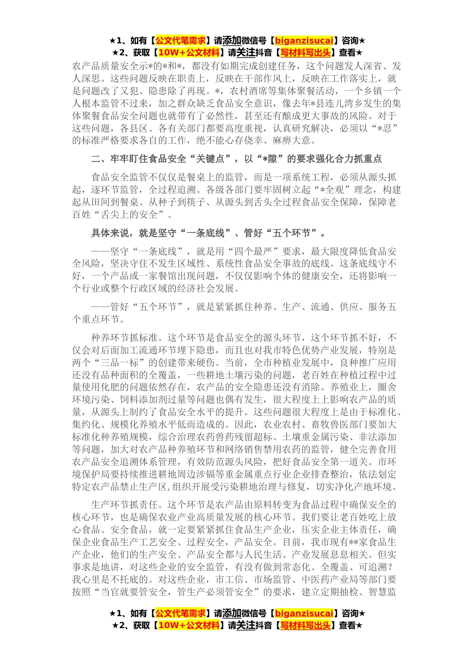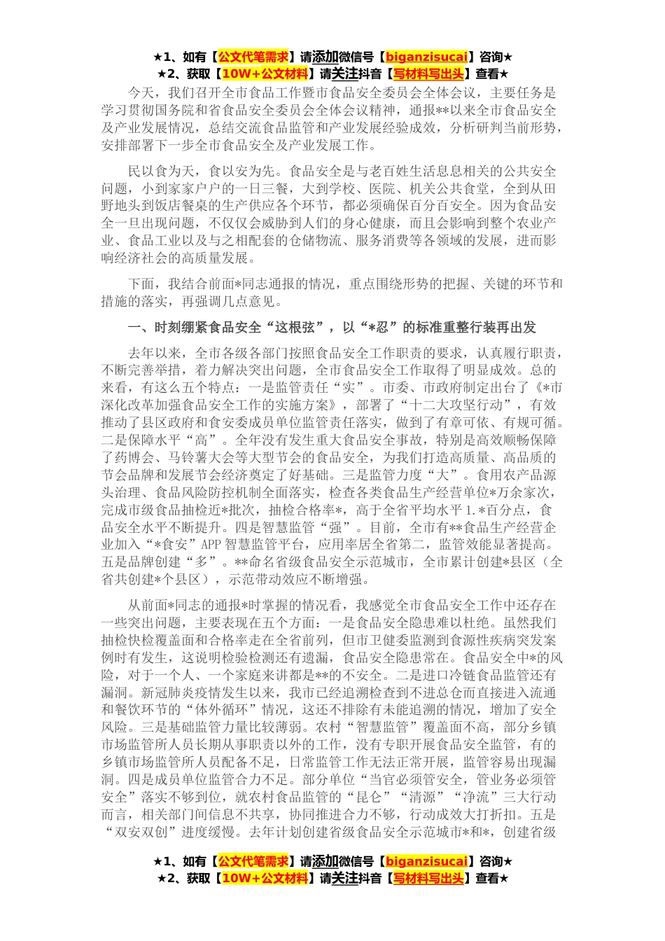★1、如有【公文代笔需求】请添加微信号【biganzisucai】咨询★★2、获取【10W+公文材料】请关注抖音【写材料写出头】查看★今天,我们召开全市食品工作暨市食品安全委员会全体会议,主要任务是学习贯彻国务院和省食品安全委员会全体会议精神,通报**以来全市食品安全及产业发展情况,总结交流食品监管和产业发展经验成效,分析研判当前形势,安排部署下一步全市食品安全及产业发展工作。民以食为天,食以安为先。食品安全是与老百姓生活息息相关的公共安全问题,小到家家户户的一日三餐,大到学校、医院、机关公共食堂,全到从田野地头到饭店餐桌的生产供应各个环节,都必须确保百分百安全。因为食品安全一旦出现问题,不仅仅会威胁到人们的身心健康,而且会影响到整个农业产业、食品工业以及与之相配套的仓储物...