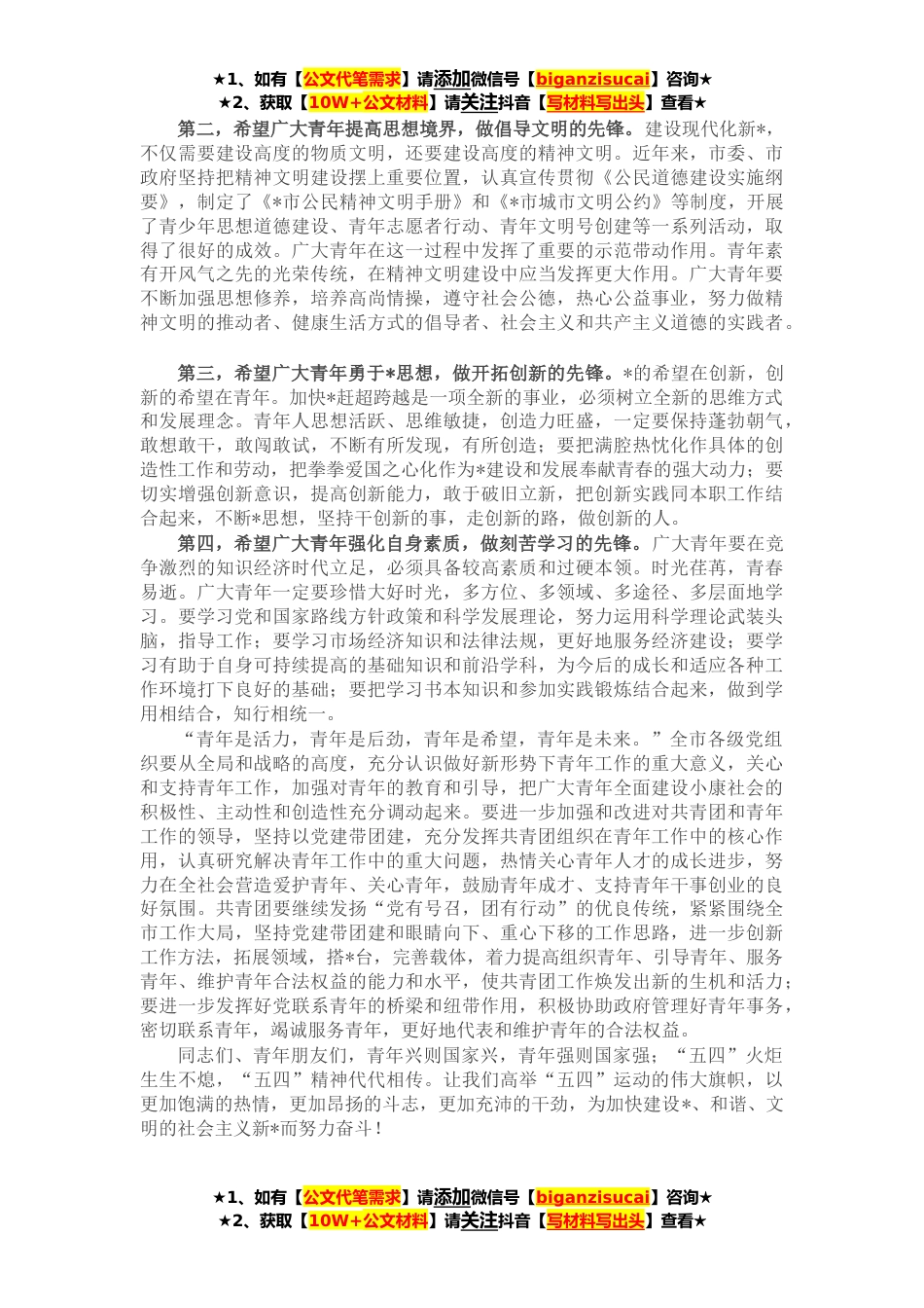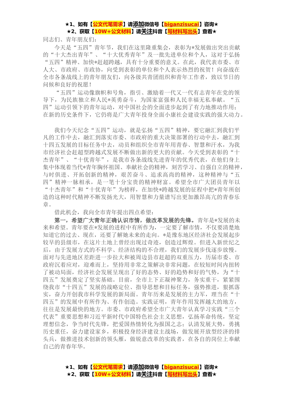 ★1、如有【公文代笔需求】请添加微信号【biganzisucai】咨询★★2、获取【10W+公文材料】请关注抖音【写材料写出头】查看★同志们、青年朋友们:今天是“五四”青年节,我们在这里隆重集会,表彰为*发展做出突出贡献的“十大杰出青年”、“十大优秀青年”及一批先进单位和个人,这对于弘扬“五四”精神、加快*赶超跨越,具有十分重要的意义。在此,我代表市委、市人大、市政府、市政协,向受到表彰的单位和个人表示热烈的祝贺!向奋战在全市各条战线上的青年朋友们,向各级共青团组织和青年工作者,致以节日的问候和良好的祝愿!“五四”运动像旗帜和号角,指引、激励着一代又一代有志青年在党的领导下,为民族独立和人民*英勇奋斗,为国家富强和人民幸福无私奉献。“五四”运动引领下的青年运动,对中国社会的全...