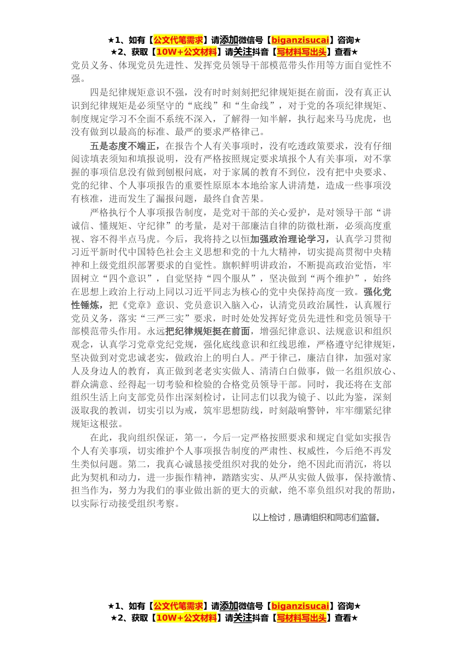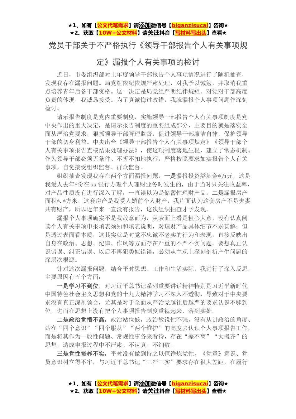 ★1、如有【公文代笔需求】请添加微信号【biganzisucai】咨询★★2、获取【10W+公文材料】请关注抖音【写材料写出头】查看★党员干部关于不严格执行《领导干部报告个人有关事项规定》漏报个人有关事项的检讨近日,市委组织部对上年度领导干部报告个人事项情况进行了随机抽查,发现我存在漏报问题。局党组依纪依规严肃处理,对我予以诫勉,并取消我重点培养青年后备干部资格。这一决定是局党组严明纪律规矩、对党对干部高度负责的体现,我诚恳接受。为了真诚悔过改错,我就漏报个人事项问题作深刻检讨。请示报告制度是党内重要制度,实施领导干部报告个人有关事项制度是党中央作出的重大决定,是请示报告制度的重要组成部分,主要目的就是落实全面从严治党要求,狠抓领导干部管理监督,促进领导干部廉洁自律,保护...