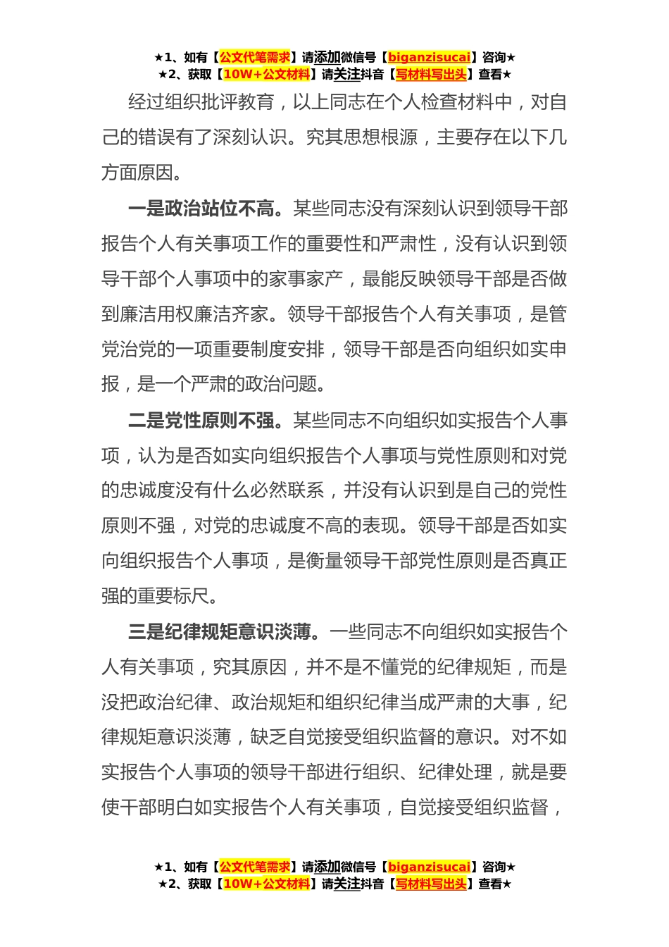 ★1、如有【公文代笔需求】请添加微信号【biganzisucai】咨询★★2、获取【10W+公文材料】请关注抖音【写材料写出头】查看★市委处级领导干部不如实报告个人有关事项问题的原因剖析及整改措施实施领导干部报告个人有关事项制度,是党中央作出的重要决定,对于落实党要管党、从严治党方针,加强领导干部管理监督,促进领导干部廉洁从政,发挥了重要作用今年以来,总体看,各级领导干部在执行个人有关事项报告规定上是严肃认真的,但也有个别领导干部违反规定不如实报告,严重违反党的纪律。为严肃党规党纪,警示领导干部高度重视、严肃对待个人有关事项报告工作,现将有关情况通报如下。一、通报情况(具体问题略)为落实党要管党、全面从严治党要求,市委对以上不如实报告个人有关事项行为进行了严肃查处,这是市...
