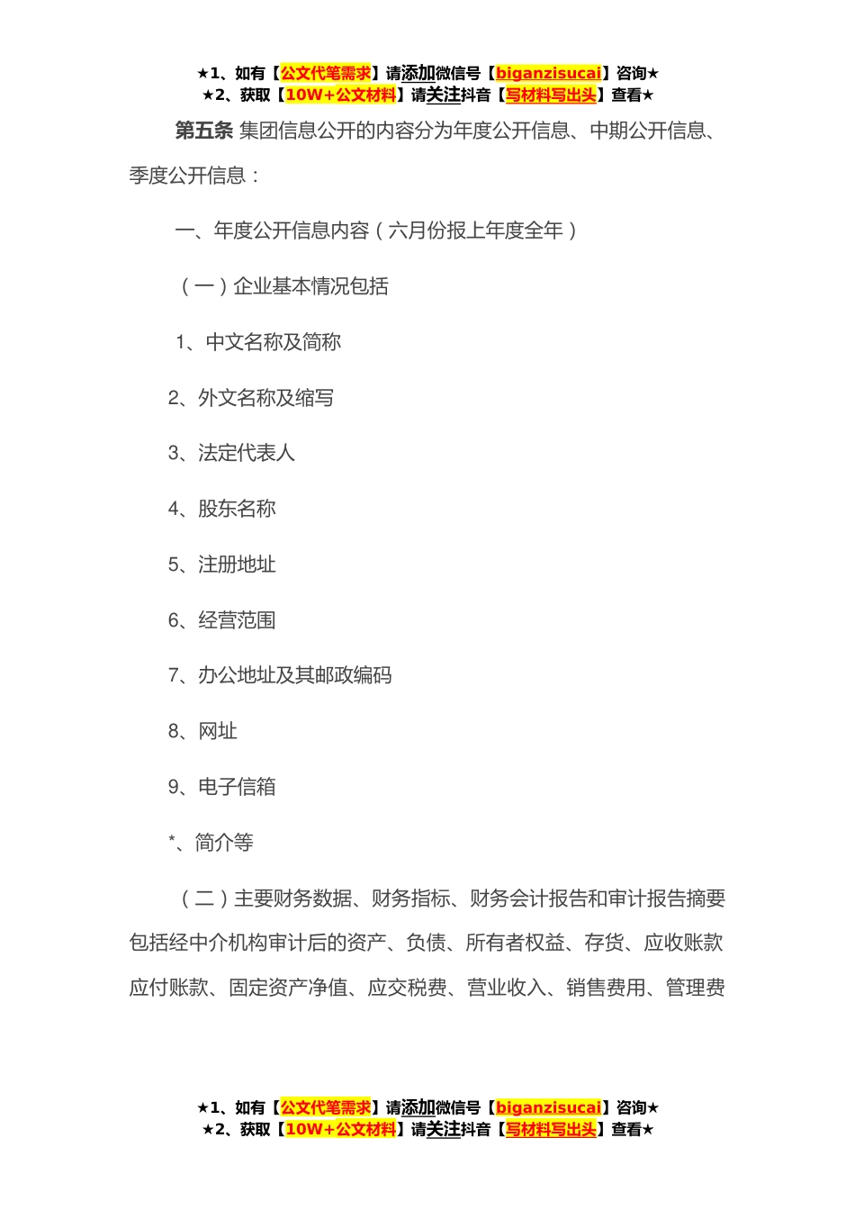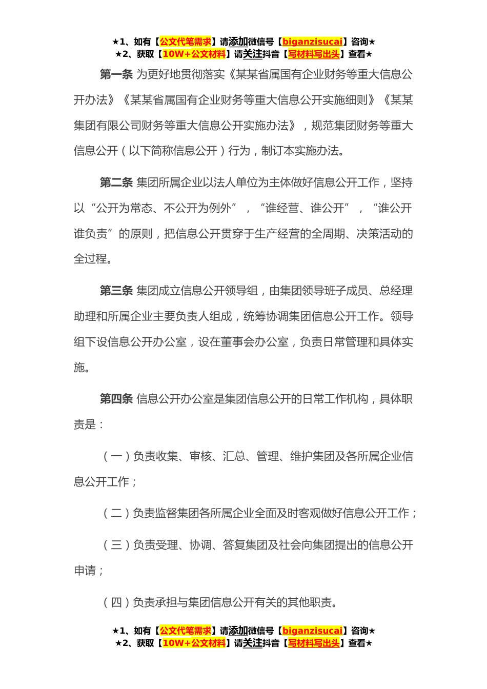 ★1、如有【公文代笔需求】请添加微信号【biganzisucai】咨询★★2、获取【10W+公文材料】请关注抖音【写材料写出头】查看★第一条为更好地贯彻落实《某某省属国有企业财务等重大信息公开办法》《某某省属国有企业财务等重大信息公开实施细则》《某某集团有限公司财务等重大信息公开实施办法》,规范集团财务等重大信息公开(以下简称信息公开)行为,制订本实施办法。第二条集团所属企业以法人单位为主体做好信息公开工作,坚持以“公开为常态、不公开为例外”,“谁经营、谁公开”,“谁公开谁负责”的原则,把信息公开贯穿于生产经营的全周期、决策活动的全过程。第三条集团成立信息公开领导组,由集团领导班子成员、总经理助理和所属企业主要负责人组成,统筹协调集团信息公开工作。领导组下设信息公开办公室...