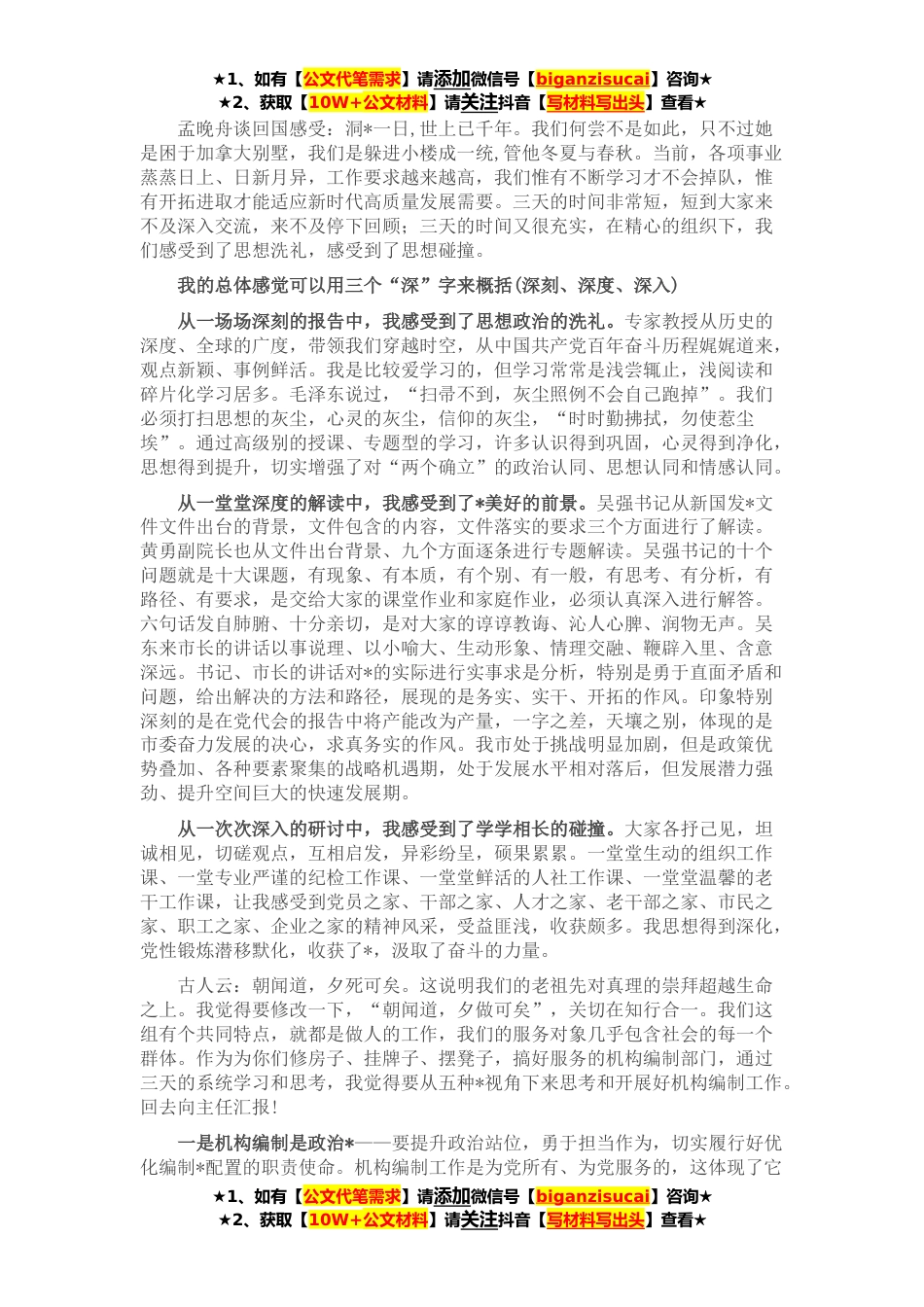 ★1、如有【公文代笔需求】请添加微信号【biganzisucai】咨询★★2、获取【10W+公文材料】请关注抖音【写材料写出头】查看★孟晚舟谈回国感受:洞*一日,世上已千年。我们何尝不是如此,只不过她是困于加拿大别墅,我们是躲进小楼成一统,管他冬夏与春秋。当前,各项事业蒸蒸日上、日新月异,工作要求越来越高,我们惟有不断学习才不会掉队,惟有开拓进取才能适应新时代高质量发展需要。三天的时间非常短,短到大家来不及深入交流,来不及停下回顾;三天的时间又很充实,在精心的组织下,我们感受到了思想洗礼,感受到了思想碰撞。我的总体感觉可以用三个“深”字来概括(深刻、深度、深入)从一场场深刻的报告中,我感受到了思想政治的洗礼。专家教授从历史的深度、全球的广度,带领我们穿越时空,从中国共产党百年奋...