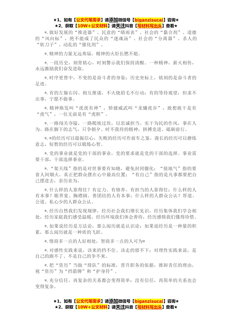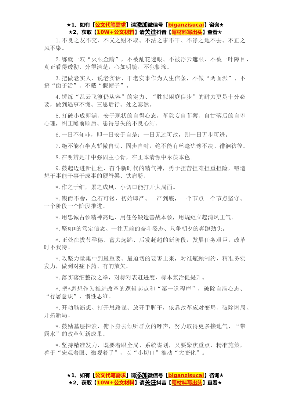 ★1、如有【公文代笔需求】请添加微信号【biganzisucai】咨询★★2、获取【10W+公文材料】请关注抖音【写材料写出头】查看★1.不良之友不交、不义之财不取、不法之事不干、不净之地不去、不正之风不染。2.练就一双“火眼金睛”,不被乱花迷眼、不被浮云遮眼、不被一叶障目,真正看得透彻、分得清楚,心如明镜,不犯糊涂。3.把做老实人、说老实话、干老实事作为人生信条,不做“两面派”、不搞“面子活”、不戴“假帽子”。4.锤炼“乱云飞渡仍从容”的定力、“胜似闲庭信步”的耐力更是十分必要,做到遇事不慌、三思后行、处之泰然。5.打破小成即满、安于现状的自得心态,革除妄自菲薄、自甘落后的自卑心理,纠正瞻前顾后、患得患失的不良心结。6.一日不知非,即一日安于自是;一日无过可改,则一日无步可进。7.绝...