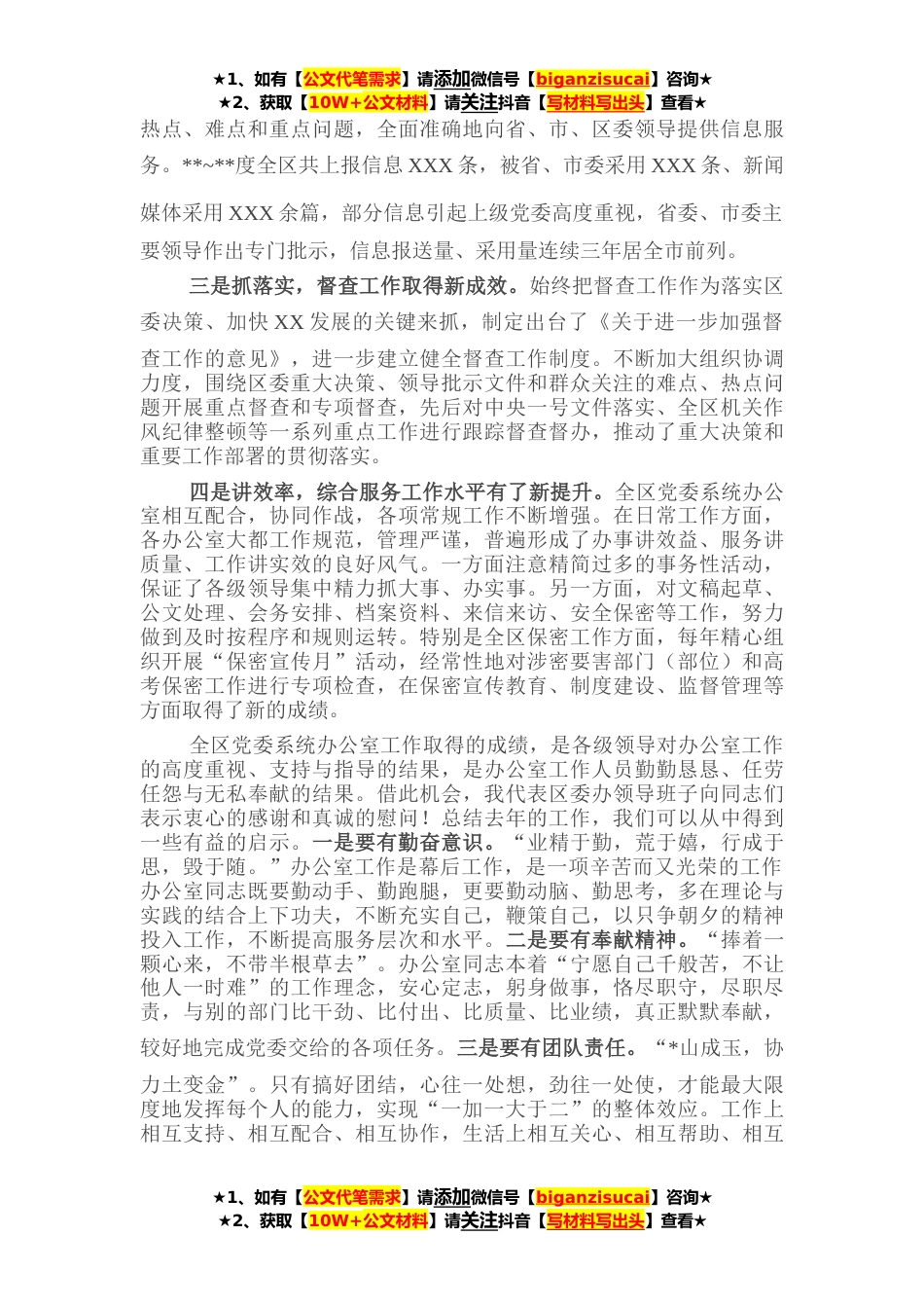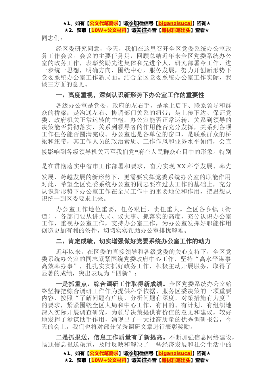 ★1、如有【公文代笔需求】请添加微信号【biganzisucai】咨询★★2、获取【10W+公文材料】请关注抖音【写材料写出头】查看★同志们:经区委研究同意,今天,我们在这里召开全区党委系统办公室政务工作会议。会议的主要任务是,回顾总结近年来全区党委系统办公室的政务工作,表彰奖励先进集体和先进个人,研究部署今工作,进一步统一思想,明确方向,围绕中心,服务发展,努力开创新形势下党委系统办公室工作新局面。结合全区党委系统办公室工作实际,我谈三方面的意见。一、高度重视,深刻认识新形势下办公室工作的重要性各级办公室是党委、政府的左右手,是承上启下、联系领导和群众的桥梁;是沟通左右、协调部门关系的纽带;是上传下达、保证党委、政府机关正常运转的中枢。办公室能否正常运转,关系到领导的决...