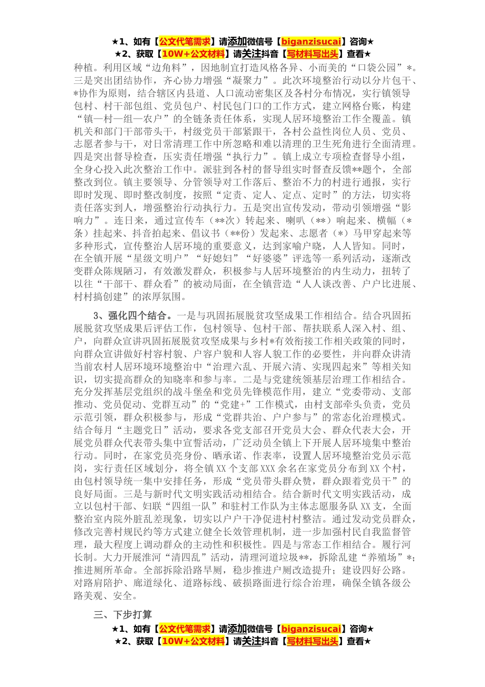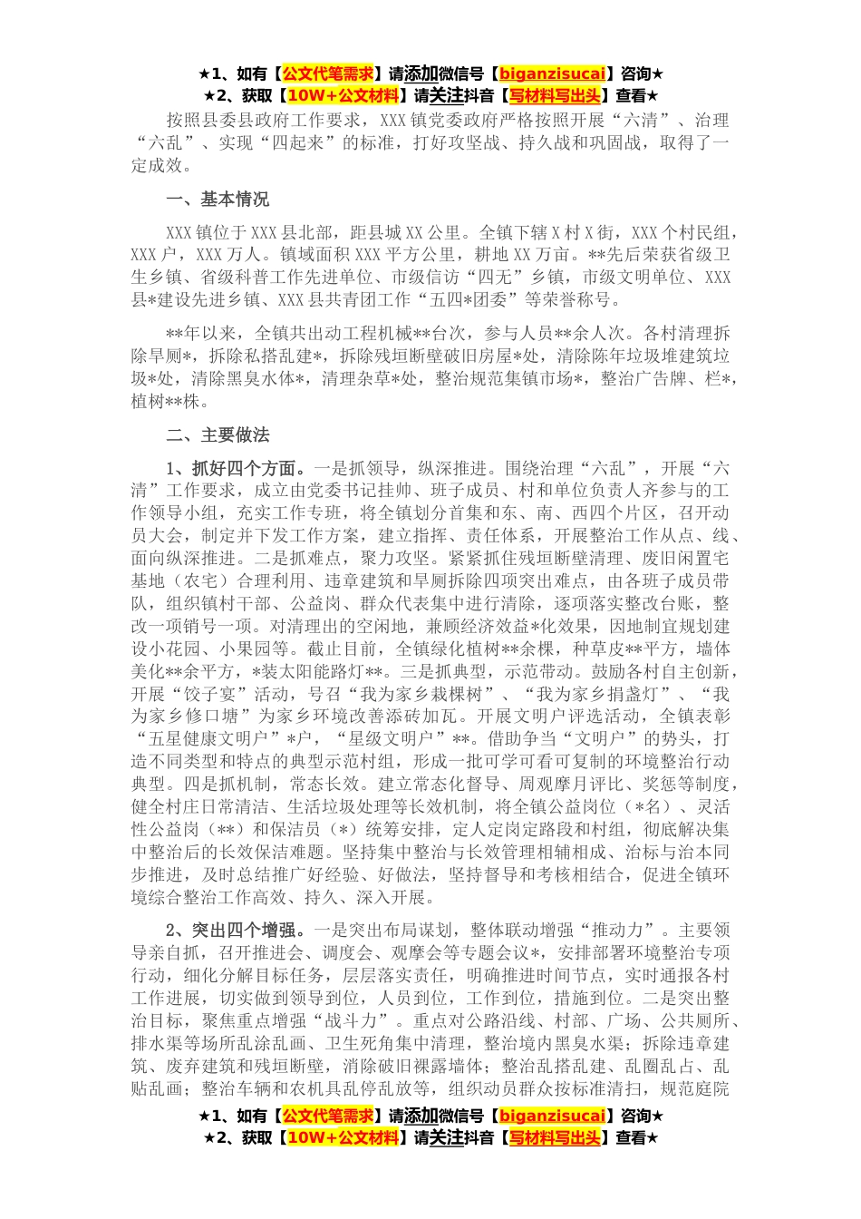 ★1、如有【公文代笔需求】请添加微信号【biganzisucai】咨询★★2、获取【10W+公文材料】请关注抖音【写材料写出头】查看★按照县委县政府工作要求,XXX镇党委政府严格按照开展“六清”、治理“六乱”、实现“四起来”的标准,打好攻坚战、持久战和巩固战,取得了一定成效。一、基本情况XXX镇位于XXX县北部,距县城XX公里。全镇下辖X村X街,XXX个村民组,XXX户,XXX万人。镇域面积XXX平方公里,耕地XX万亩。**先后荣获省级卫生乡镇、省级科普工作先进单位、市级信访“四无”乡镇,市级文明单位、XXX县*建设先进乡镇、XXX县共青团工作“五四*团委”等荣誉称号。**年以来,全镇共出动工程机械**台次,参与人员**余人次。各村清理拆除旱厕*,拆除私搭乱建*,拆除残垣断壁破旧房屋*处,清除陈年垃圾堆建筑垃圾*处,清...