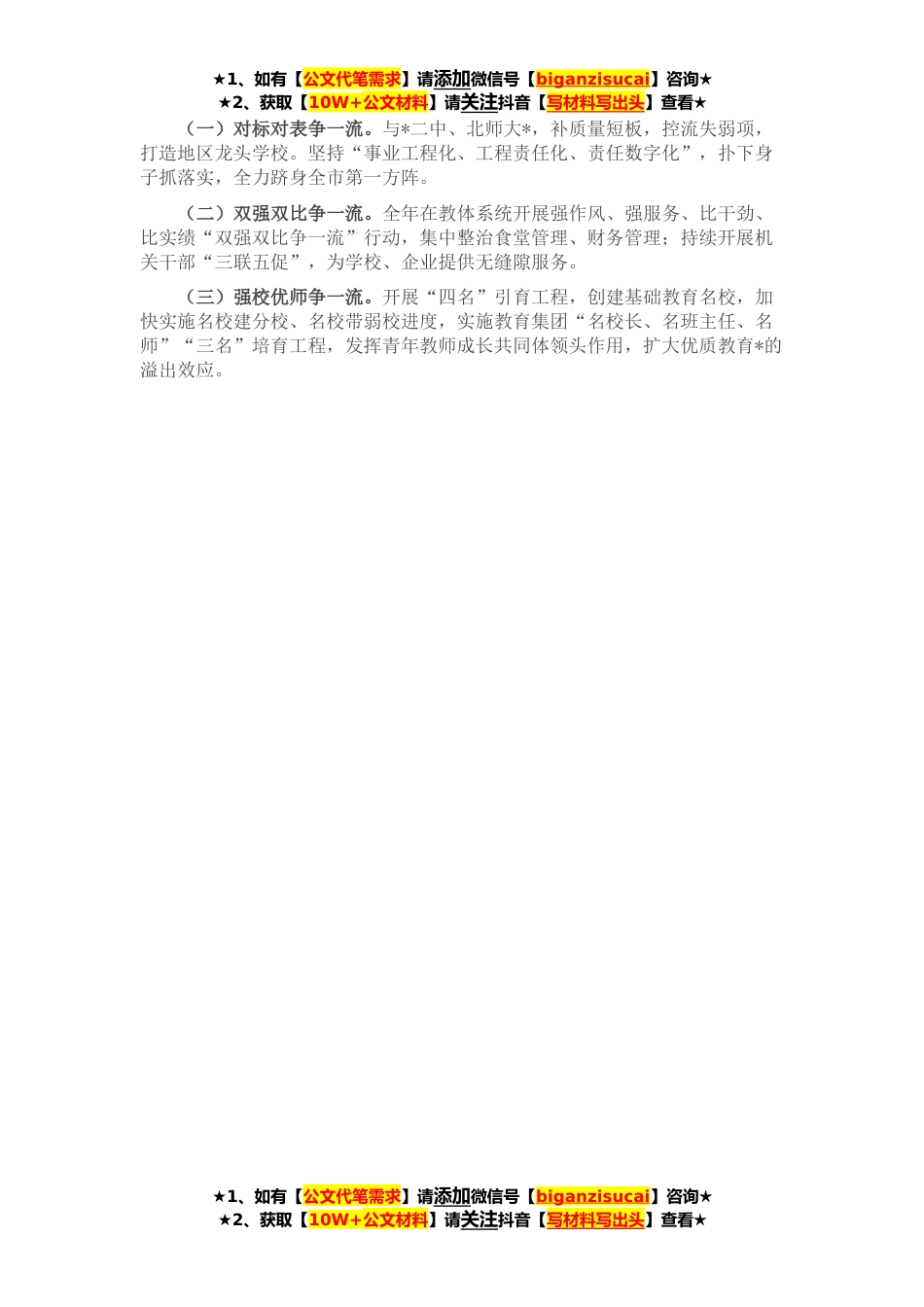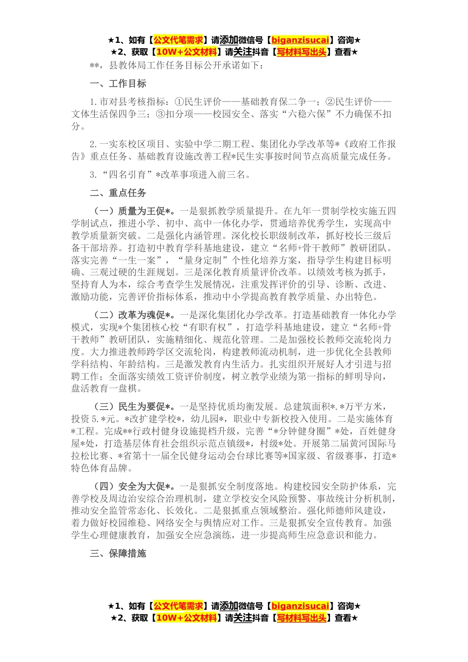 ★1、如有【公文代笔需求】请添加微信号【biganzisucai】咨询★★2、获取【10W+公文材料】请关注抖音【写材料写出头】查看★**,县教体局工作任务目标公开承诺如下:一、工作目标1.市对县考核指标:①民生评价——基础教育保二争一;②民生评价——文体生活保四争三;③扣分项——校园安全、落实“六稳六保”不力确保不扣分。2.一实东校区项目、实验中学二期工程、集团化办学改革等*《政府工作报告》重点任务、基础教育设施改善工程*民生实事按时间节点高质量完成任务。3.“四名引育”*改革事项进入前三名。二、重点任务(一)质量为王促*。一是狠抓教学质量提升。在九年一贯制学校实施五四学制试点,推进小学、初中、高中一体化办学,贯通培养优秀学生,实现高中教学质量新突破。二是强化内涵管理。深化校长职级...