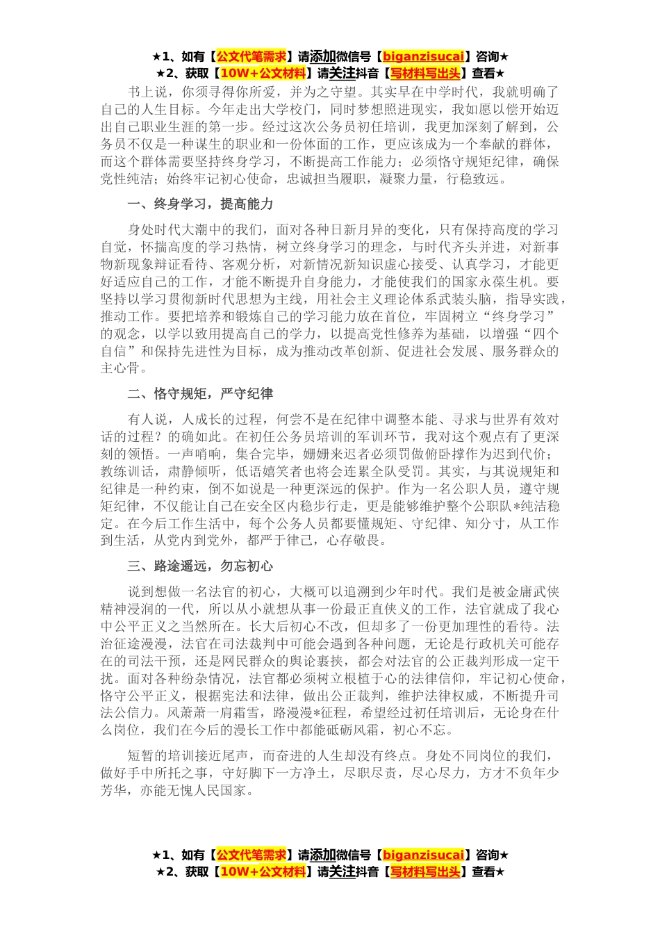 ★1、如有【公文代笔需求】请添加微信号【biganzisucai】咨询★★2、获取【10W+公文材料】请关注抖音【写材料写出头】查看★书上说,你须寻得你所爱,并为之守望。其实早在中学时代,我就明确了自己的人生目标。今年走出大学校门,同时梦想照进现实,我如愿以偿开始迈出自己职业生涯的第一步。经过这次公务员初任培训,我更加深刻了解到,公务员不仅是一种谋生的职业和一份体面的工作,更应该成为一个奉献的群体,而这个群体需要坚持终身学习,不断提高工作能力;必须恪守规矩纪律,确保党性纯洁;始终牢记初心使命,忠诚担当履职,凝聚力量,行稳致远。一、终身学习,提高能力身处时代大潮中的我们,面对各种日新月异的变化,只有保持高度的学习自觉,怀揣高度的学习热情,树立终身学习的理念,与时代齐头并进,...
