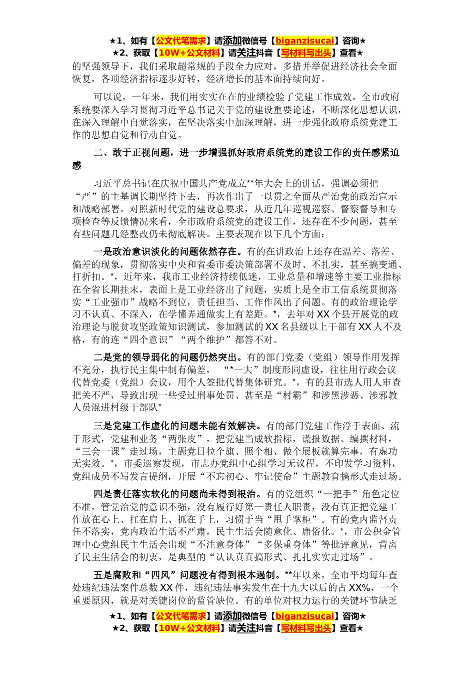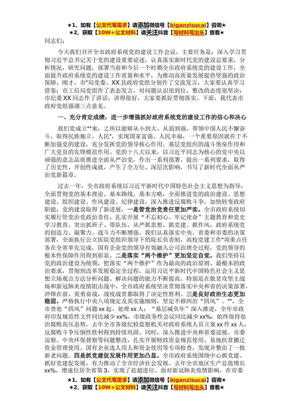 ★1、如有【公文代笔需求】请添加微信号【biganzisucai】咨询★★2、获取【10W+公文材料】请关注抖音【写材料写出头】查看★同志们:今天我们召开全市政府系统党的建设工作会议,主要任务是:深入学习贯彻习近平总书记关于党的建设重要论述,认真落实新时代党的建设总要求,分析情况,研究问题,部署当前和今后一个时期全市政府系统党的建设工作,全面提升政府系统党的建设工作质量和水平,为推动高质量发展提供坚强的政治保障。刚才,市*局党委、XX县政府党组分别作了交流发言,大家要认真学习借鉴;市工信局党组作了表态发言,对问题认识很到位,整改的态度很坚决;市纪委XX同志作了讲话,讲得很好,大家要抓好贯彻落实。下面,我代表市政府党组强调三点意见。一、充分肯定成绩,进一步增强抓好政府系统党的建设...