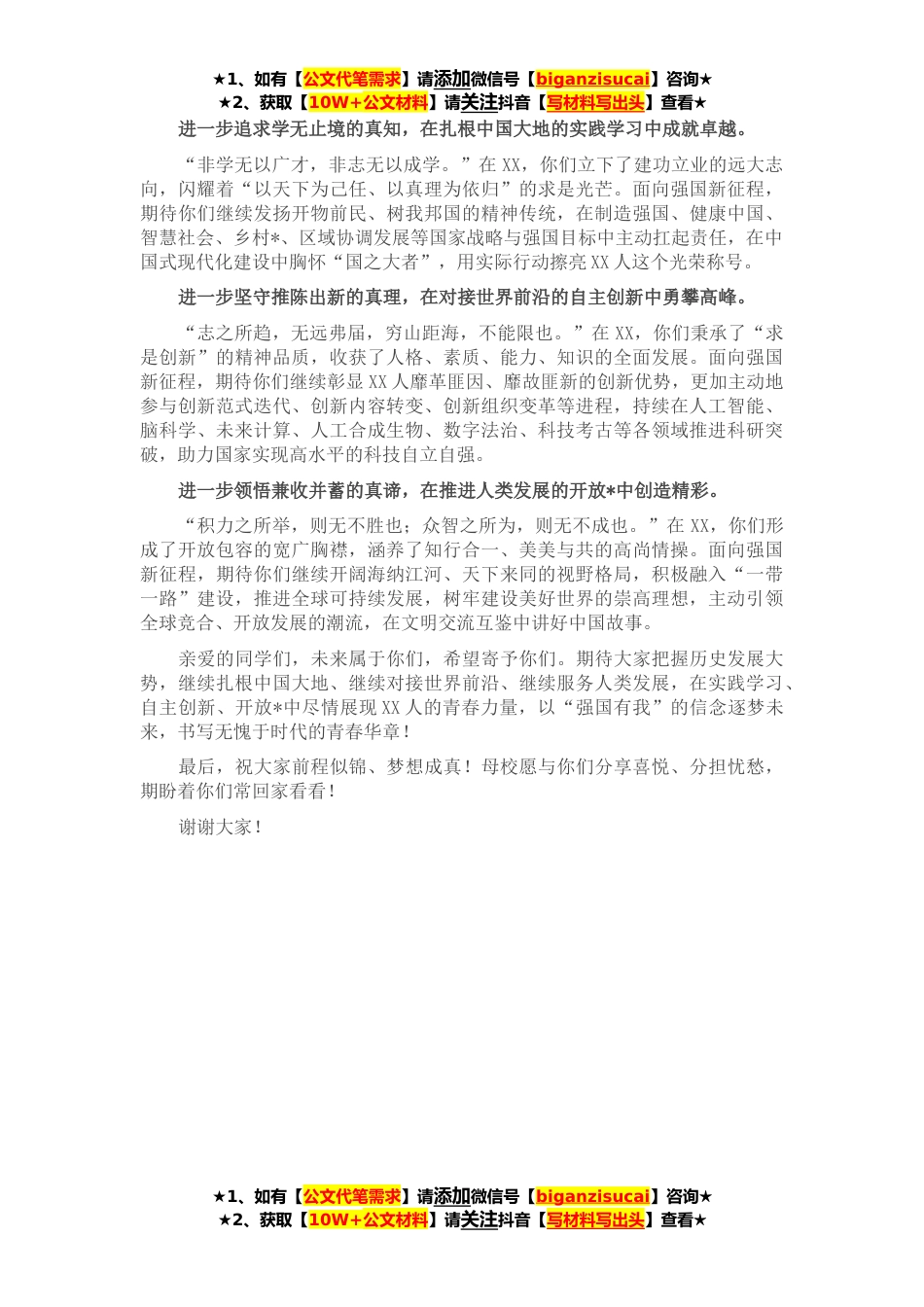 ★1、如有【公文代笔需求】请添加微信号【biganzisucai】咨询★★2、获取【10W+公文材料】请关注抖音【写材料写出头】查看★亲爱的**届同学们:大家上午好!三月的XXX,春和景明、万物竞茂,处处洋溢着青春的气息。在这个充满朝气的美好时节,你们即将封存过去时光的“专属记忆”,开启未来人生的“崭新篇章”。作为校长和学长,我由衷地为大家感到高兴。首先,我谨代表学校,向圆满完成学业、顺利毕业的你们,送上热烈的祝贺!向辛勤培育和支持你们成长成才的老师们、家长们,表示诚挚的感谢!面对奔涌向前的历史大势,李大钊先生曾疾呼:“国家不可一日无青年,青年不可一日无觉醒。”青年是整个社会力量中最积极、最有生气的力量,是国家的希望、民族的未来。与百年前中国青年不同的是,以在座各位为代表的当代...
