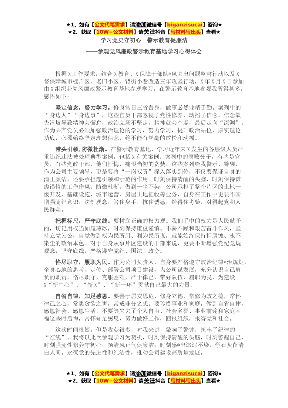 ★1、如有【公文代笔需求】请添加微信号【biganzisucai】咨询★★2、获取【10W+公文材料】请关注抖音【写材料写出头】查看★学习党史守初心警示教育促廉洁——参观党风廉政警示教育基地学习心得体会根据X工作要求,结合X教育、X保障干部队*风突出问题整肃行动以及X督保障城市棚户区、老旧小区、背街小巷改造三年攻坚行动,X年X月X日参加由X组织赴党风廉政警示教育基地参观学习,在警示教育基地参观我所得甚多,感悟如下:坚定信念,努力学习。修身常日三省吾身,做事必然业精于勤。案列中的“身边人”“身边事”,这些官员干部忽视了党性修养,动摇了信念。信念缺失滑坡导致精神会懈怠,政治立场不坚定,精神就会空虚,最后走向“深渊”。作为共产党员必须加强政治理论的学习,努力学习,提升政治站位,厚实理论功...