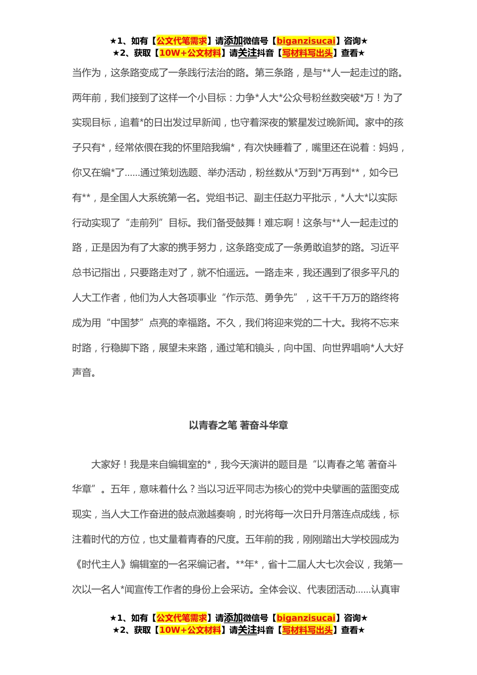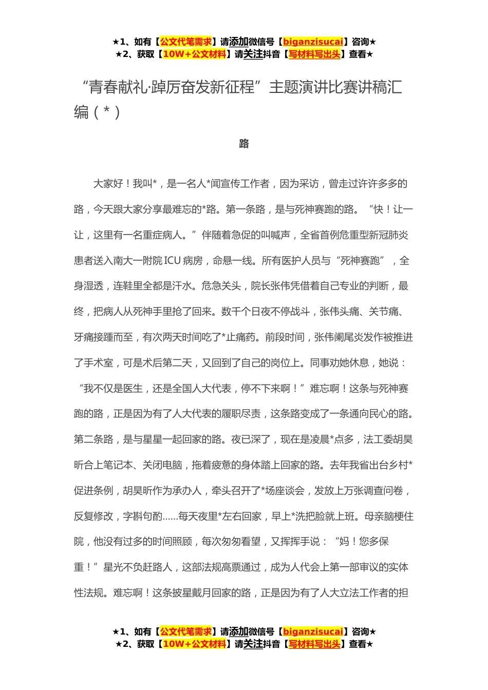 ★1、如有【公文代笔需求】请添加微信号【biganzisucai】咨询★★2、获取【10W+公文材料】请关注抖音【写材料写出头】查看★“青春献礼·踔厉奋发新征程”主题演讲比赛讲稿汇编(*)路大家好!我叫*,是一名人*闻宣传工作者,因为采访,曾走过许许多多的路,今天跟大家分享最难忘的*路。第一条路,是与死神赛跑的路。“快!让一让,这里有一名重症病人。”伴随着急促的叫喊声,全省首例危重型新冠肺炎患者送入南大一附院ICU病房,命悬一线。所有医护人员与“死神赛跑”,全身湿透,连鞋里全都是汗水。危急关头,院长张伟凭借着自己专业的判断,最终,把病人从死神手里抢了回来。数千个日夜不停战斗,张伟头痛、关节痛、牙痛接踵而至,有次两天时间吃了*止痛药。前段时间,张伟阑尾炎发作被推进了手术室,可是术后...