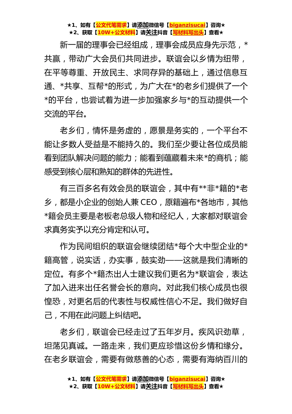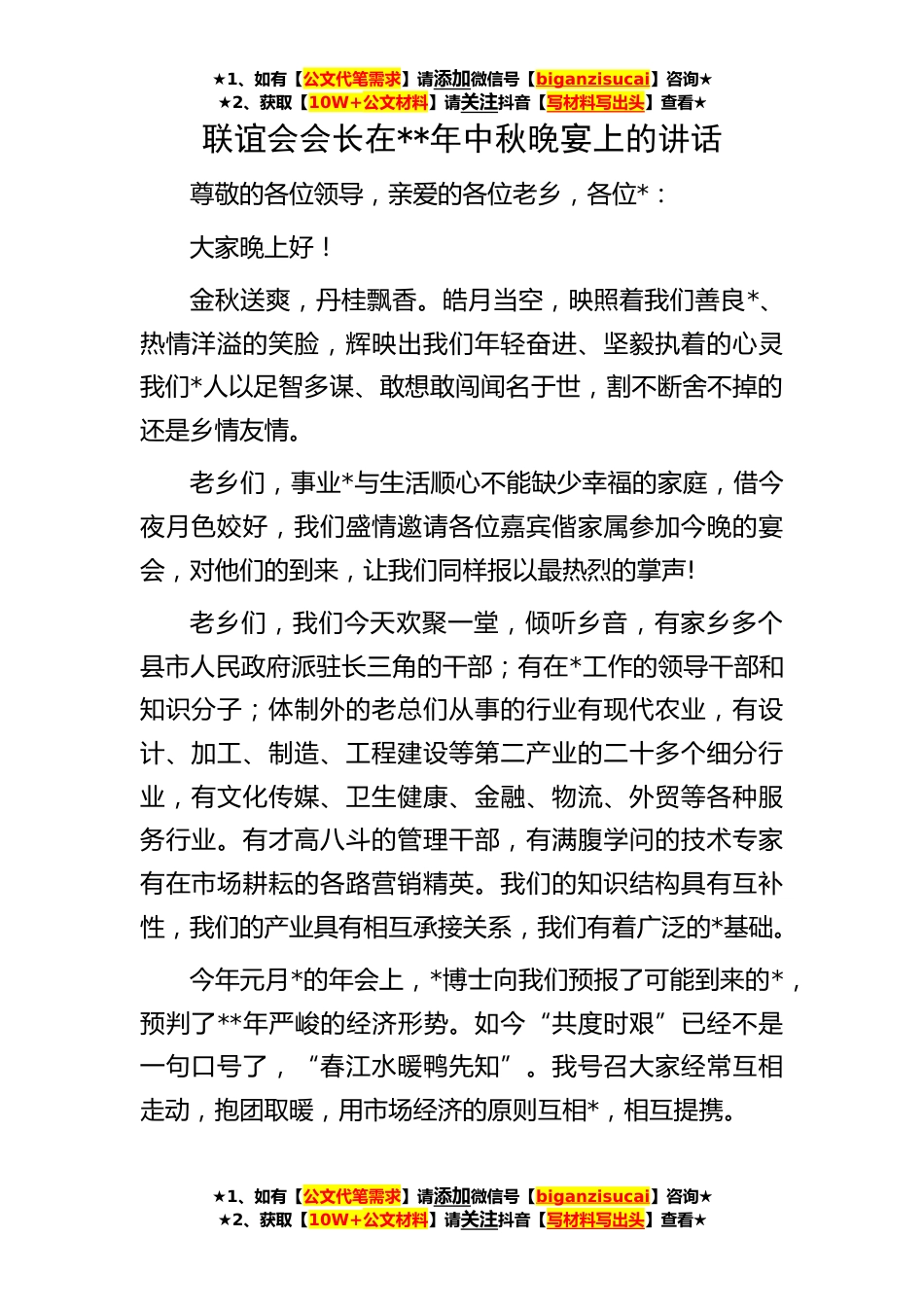 ★1、如有【公文代笔需求】请添加微信号【biganzisucai】咨询★★2、获取【10W+公文材料】请关注抖音【写材料写出头】查看★联谊会会长在**年中秋晚宴上的讲话尊敬的各位领导,亲爱的各位老乡,各位*:大家晚上好!金秋送爽,丹桂飘香。皓月当空,映照着我们善良*、热情洋溢的笑脸,辉映出我们年轻奋进、坚毅执着的心灵我们*人以足智多谋、敢想敢闯闻名于世,割不断舍不掉的还是乡情友情。老乡们,事业*与生活顺心不能缺少幸福的家庭,借今夜月色姣好,我们盛情邀请各位嘉宾偕家属参加今晚的宴会,对他们的到来,让我们同样报以最热烈的掌声!老乡们,我们今天欢聚一堂,倾听乡音,有家乡多个县市人民政府派驻长三角的干部;有在*工作的领导干部和知识分子;体制外的老总们从事的行业有现代农业,有设计、加工、制...
