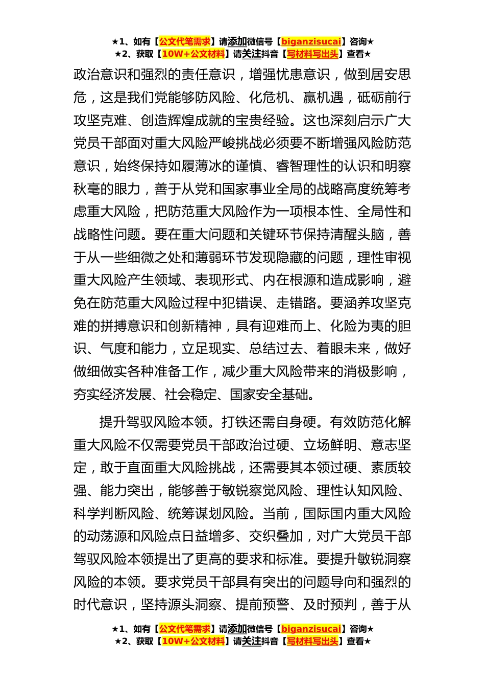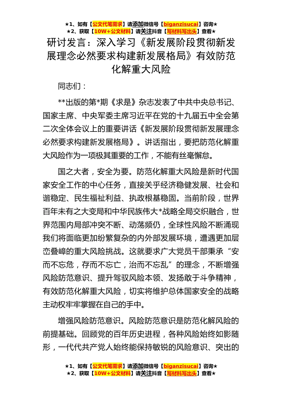 ★1、如有【公文代笔需求】请添加微信号【biganzisucai】咨询★★2、获取【10W+公文材料】请关注抖音【写材料写出头】查看★研讨发言:深入学习《新发展阶段贯彻新发展理念必然要求构建新发展格局》有效防范化解重大风险同志们:**出版的第*期《求是》杂志发表了中共中央总书记、国家主席、中央军委主席习近平在党的十九届五中全会第二次全体会议上的重要讲话《新发展阶段贯彻新发展理念必然要求构建新发展格局》。讲话指出,要把防范化解重大风险作为一项极其重要的工作,不能有丝毫懈怠。国之大者,安全为要。防范化解重大风险是新时代国家安全工作的中心任务,直接关乎经济稳健发展、社会和谐稳定、民生福祉利益、执政根基稳固。当前阶段,世界百年未有之大变局和中华民族伟大*战略全局交织融合,世界范围内局...