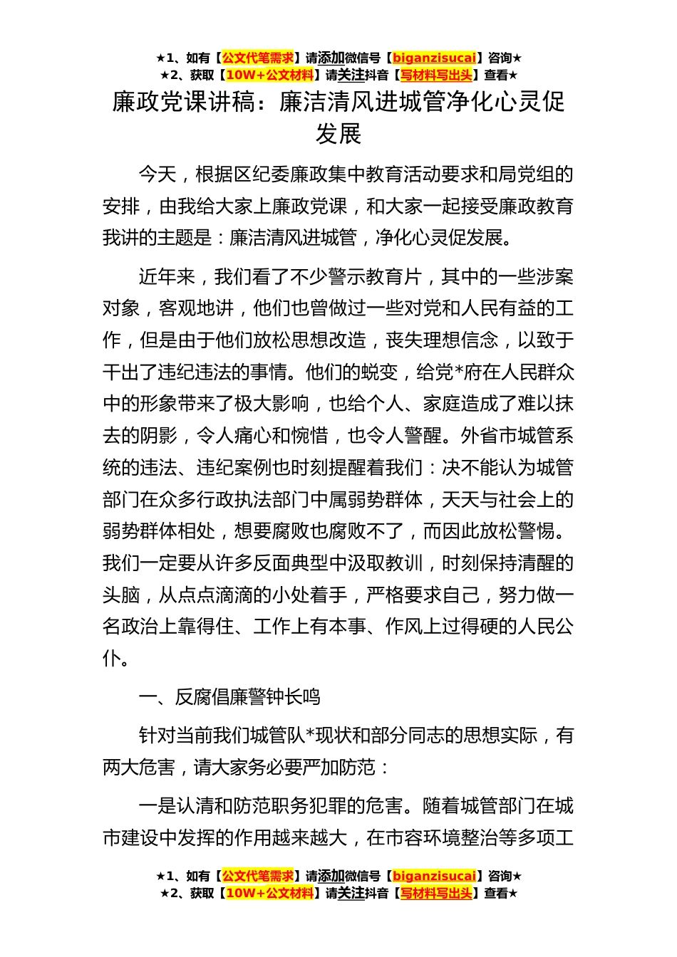 ★1、如有【公文代笔需求】请添加微信号【biganzisucai】咨询★★2、获取【10W+公文材料】请关注抖音【写材料写出头】查看★廉政党课讲稿:廉洁清风进城管净化心灵促发展今天,根据区纪委廉政集中教育活动要求和局党组的安排,由我给大家上廉政党课,和大家一起接受廉政教育我讲的主题是:廉洁清风进城管,净化心灵促发展。近年来,我们看了不少警示教育片,其中的一些涉案对象,客观地讲,他们也曾做过一些对党和人民有益的工作,但是由于他们放松思想改造,丧失理想信念,以致于干出了违纪违法的事情。他们的蜕变,给党*府在人民群众中的形象带来了极大影响,也给个人、家庭造成了难以抹去的阴影,令人痛心和惋惜,也令人警醒。外省市城管系统的违法、违纪案例也时刻提醒着我们:决不能认为城管部门在众多行政执...