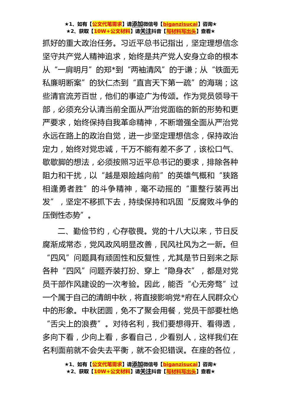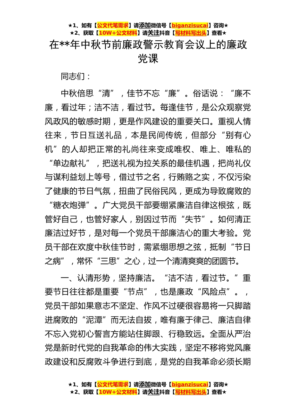 ★1、如有【公文代笔需求】请添加微信号【biganzisucai】咨询★★2、获取【10W+公文材料】请关注抖音【写材料写出头】查看★在**年中秋节前廉政警示教育会议上的廉政党课同志们:中秋倍思“清”,佳节不忘“廉”。俗话说:“廉不廉,看过年;洁不洁,看过节。每逢佳节,是公众观察党风政风的敏感时期,更是作风建设的重要关口。重视人情往来,节日互送礼品,本是民间传统,但部分“别有心机”的人却把正常的礼尚往来变成唯权、唯上、唯私的“单边献礼”,把送礼视为拉关系的最佳机遇,把尚礼仪与谋利益划上等号,借过节之名,行贿赂之实,不仅污染了健康的节日气氛,扭曲了民俗民风,更成为导致腐败的“糖衣炮弹”。广大党员干部要绷紧廉洁自律这根弦,既管好自己,也管好家人,别因过节而“失节”。如何清正廉洁...