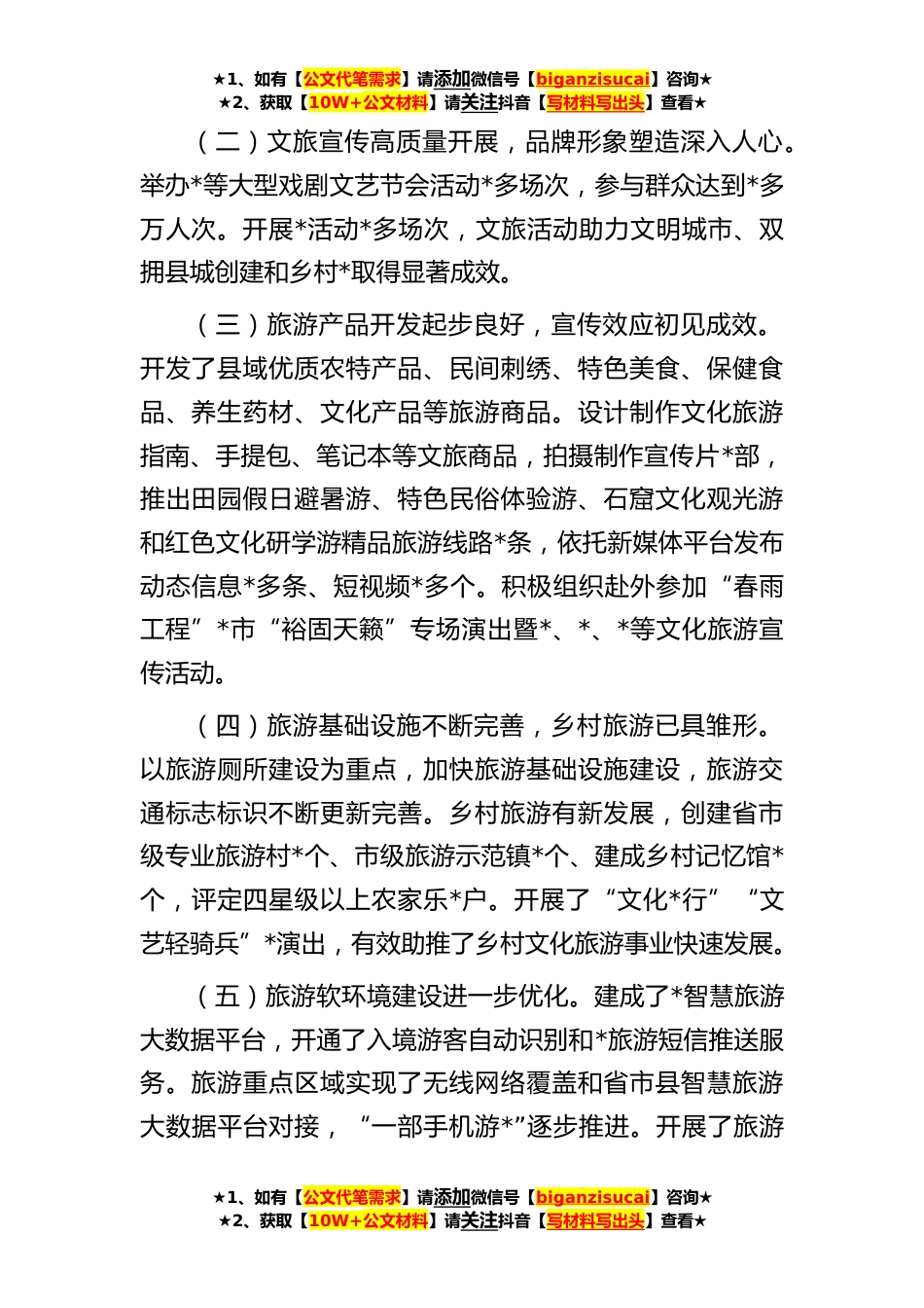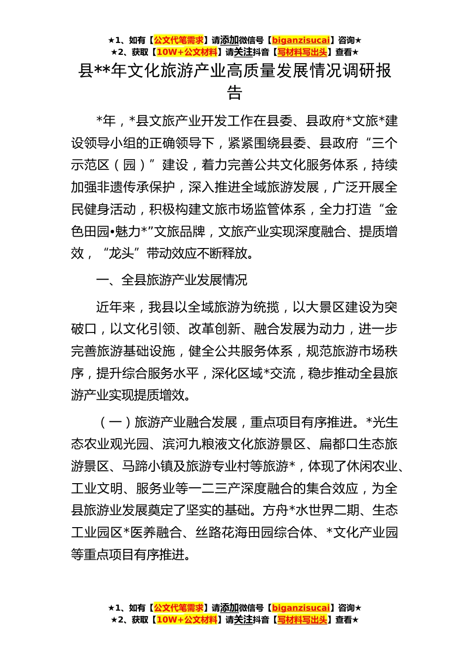 ★1、如有【公文代笔需求】请添加微信号【biganzisucai】咨询★★2、获取【10W+公文材料】请关注抖音【写材料写出头】查看★县**年文化旅游产业高质量发展情况调研报告*年,*县文旅产业开发工作在县委、县政府*文旅*建设领导小组的正确领导下,紧紧围绕县委、县政府“三个示范区(园)”建设,着力完善公共文化服务体系,持续加强非遗传承保护,深入推进全域旅游发展,广泛开展全民健身活动,积极构建文旅市场监管体系,全力打造“金色田园•魅力*”文旅品牌,文旅产业实现深度融合、提质增效,“龙头”带动效应不断释放。一、全县旅游产业发展情况近年来,我县以全域旅游为统揽,以大景区建设为突破口,以文化引领、改革创新、融合发展为动力,进一步完善旅游基础设施,健全公共服务体系,规范旅游市场秩序,提升...