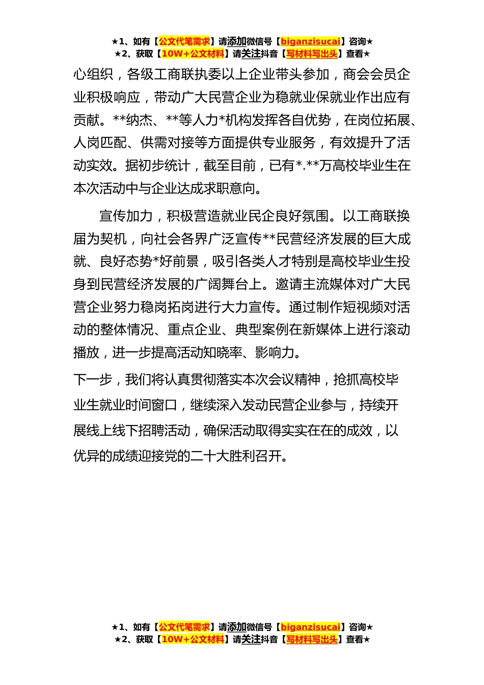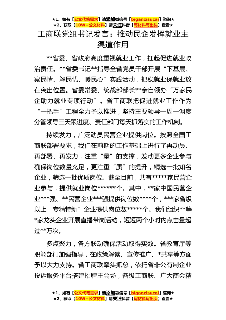 ★1、如有【公文代笔需求】请添加微信号【biganzisucai】咨询★★2、获取【10W+公文材料】请关注抖音【写材料写出头】查看★工商联党组书记发言:推动民企发挥就业主渠道作用**省委、省政府高度重视就业工作,扛起促进就业政治责任。**省委书记**指导全省党员干部开展“下基层、察民情、解民忧、暖民心”实践活动,把稳就业保就业放在突出位置。省委常委、统战部部长**亲自领办“万家民企助力就业专项行动”。省工商联把促进就业工作作为“一把手”工程全力予以推进,坚持主要领导一周一调度分管领导三天跟进度、责任部门每天抓落实的工作机制。持续发力,广泛动员民营企业提供岗位。按照全国工商联部署要求,我们在前期的工作基础上进行了再动员、再部署、再发力,注重“量”的支撑,发动更多企业参与确保岗位数...