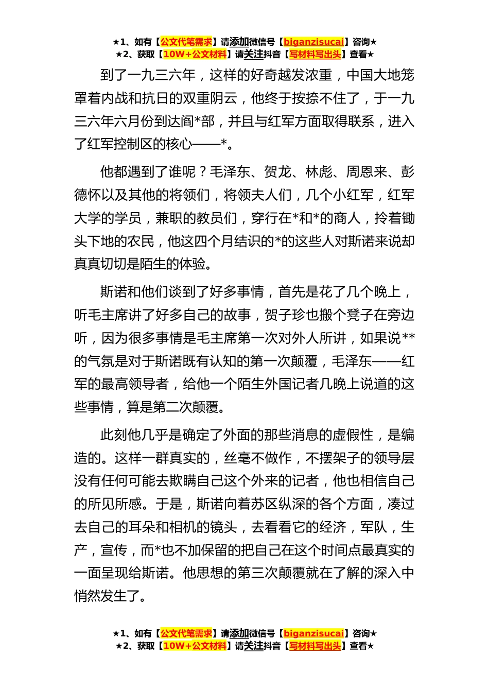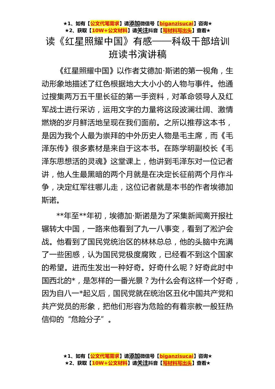 ★1、如有【公文代笔需求】请添加微信号【biganzisucai】咨询★★2、获取【10W+公文材料】请关注抖音【写材料写出头】查看★读《红星照耀中国》有感——科级干部培训班读书演讲稿《红星照耀中国》以作者艾德加·斯诺的第一视角,生动形象地描述了红色根据地大大小小的人物与事件。他通过搜集两万五千里长征的第一手资料,对革命领导人及红军战士进行采访,运用文字的力量将这段波澜壮阔、激情燃烧的岁月鲜活地呈现在我们面前。之所以推荐这本书,是因为我个人最为崇拜的中外历史人物是毛主席,而《毛泽东传》很多素材是来自于这本书。在陈学明副校长《毛泽东思想活的灵魂》这堂课上,他讲到毛泽东对一位记者讲,他人生最黑暗的两个月就是在决定长征前两个月作斗争,决定红军往哪儿走,这位记者就是本书的作者埃德...
