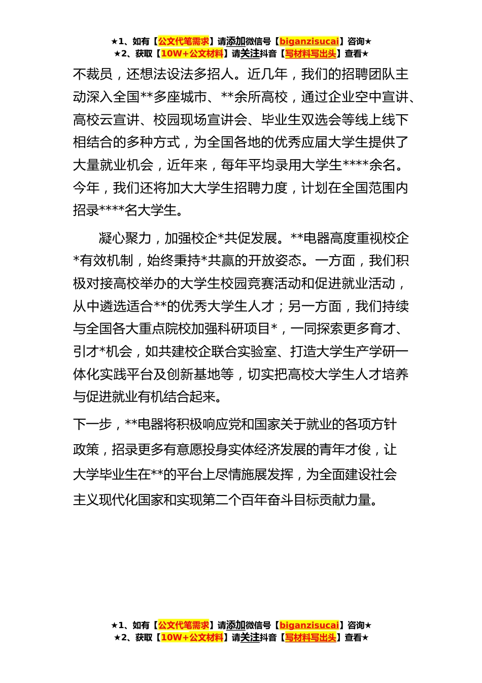 ★1、如有【公文代笔需求】请添加微信号【biganzisucai】咨询★★2、获取【10W+公文材料】请关注抖音【写材料写出头】查看★集团董事长发言:自主创新谋发展引才育才显担当**电器高度重视在大学生中招录人才工作,形成了一些行之有效的做法。自主创新,持续打造人才培育基地。发展的希望在于创新,创新的希望在于人才,而中国制造业的发展更是需要源源不断的人才。多年来**电器坚持走“自力更生、自主创新、自主培养人才”的发展道路,锻造出强大的自主创新能力。**电器强化创新能力的*投入,坚持“按需投入、不设上限”的研发费用保障,设有***个研究所、****个实验室,拥有全行业唯一的国家重点实验室、国家工程技术研究中心、国家级工业设计中心、国家认定企业技术中心受高等教育的研究人才有了施展抱负的广阔...