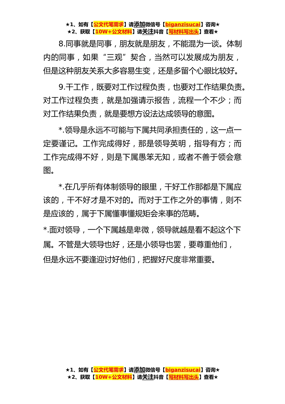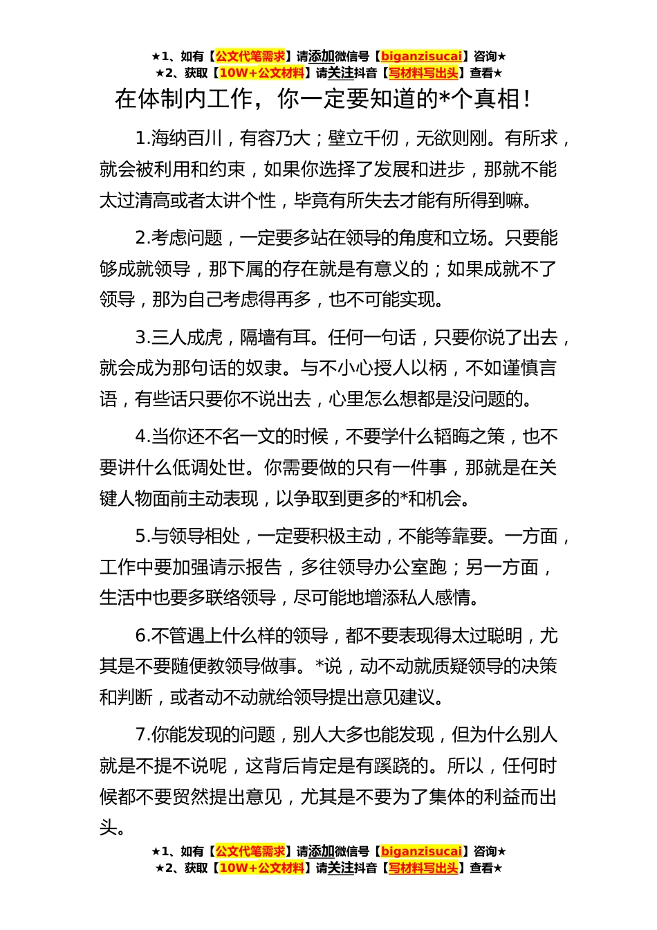 ★1、如有【公文代笔需求】请添加微信号【biganzisucai】咨询★★2、获取【10W+公文材料】请关注抖音【写材料写出头】查看★在体制内工作,你一定要知道的*个真相!1.海纳百川,有容乃大;壁立千仞,无欲则刚。有所求,就会被利用和约束,如果你选择了发展和进步,那就不能太过清高或者太讲个性,毕竟有所失去才能有所得到嘛。2.考虑问题,一定要多站在领导的角度和立场。只要能够成就领导,那下属的存在就是有意义的;如果成就不了领导,那为自己考虑得再多,也不可能实现。3.三人成虎,隔墙有耳。任何一句话,只要你说了出去,就会成为那句话的奴隶。与不小心授人以柄,不如谨慎言语,有些话只要你不说出去,心里怎么想都是没问题的。4.当你还不名一文的时候,不要学什么韬晦之策,也不要讲什么低调处世。你需要...