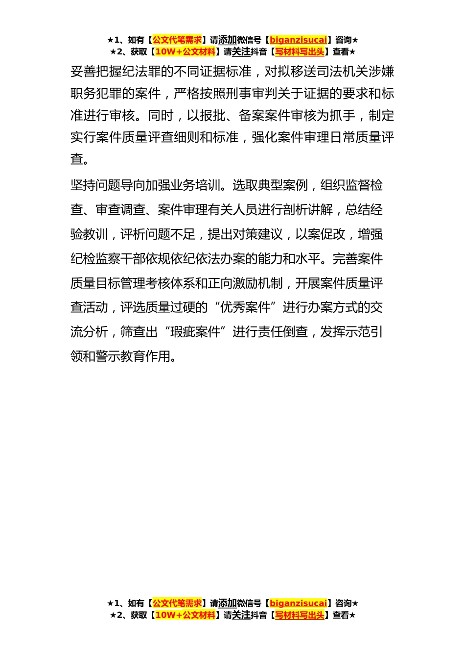 ★1、如有【公文代笔需求】请添加微信号【biganzisucai】咨询★★2、获取【10W+公文材料】请关注抖音【写材料写出头】查看★经验交流:将质量意识贯穿执纪执法全过程强化案件质量共同体意识。案件质量是纪检监察工作的核心,是“*和“*的关系,失去案件质量这个“*,其他工作都将归“*。审查调查和案件审理都是办案的法定程序,分工虽然不同,但工作目标、证据标准一致。双方应站在共同为案件质量负责的角度,换位思考,多摆事实、摆证据、讲道理,多沟通、多交换意见、多比较看法,克服“你查我审”的思维定势,将质量意识贯彻执纪执法全过程,最大限度地消除分歧、形成合力,达成共识,形成相互理解、相互支持、共同对案件质量负责的工作格局,推动依规依纪依法办案。制定案件质量参考标准。案件质量标准是开展...
