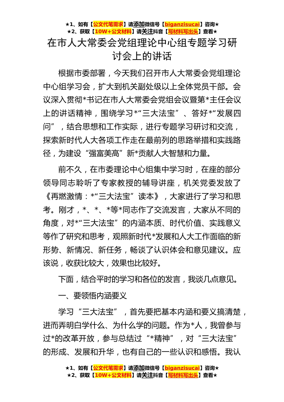 ★1、如有【公文代笔需求】请添加微信号【biganzisucai】咨询★★2、获取【10W+公文材料】请关注抖音【写材料写出头】查看★在市人大常委会党组理论中心组专题学习研讨会上的讲话根据市委部署,今天我们召开市人大常委会党组理论中心组学习会,扩大到机关副处级以上全体党员干部。会议深入贯彻*书记在市人大常委会党组会议暨第*主任会议上的讲话精神,围绕学习*“三大法宝”、答好*“发展四问”,结合思想和工作实际,进行专题学习研讨和交流,探索新时代人大各项工作走在最前列的思路举措和实践路径,为建设“强富美高”新*贡献人大智慧和力量。前不久,在市委理论中心组集中学习时,在座的部分领导同志聆听了专家教授的辅导讲座,机关党委发放了《再燃激情:*“三大法宝”读本》,大家进行了学习和思考。刚才,*...