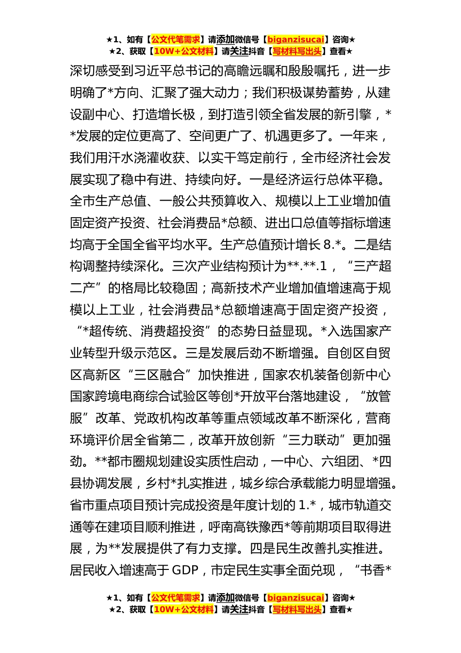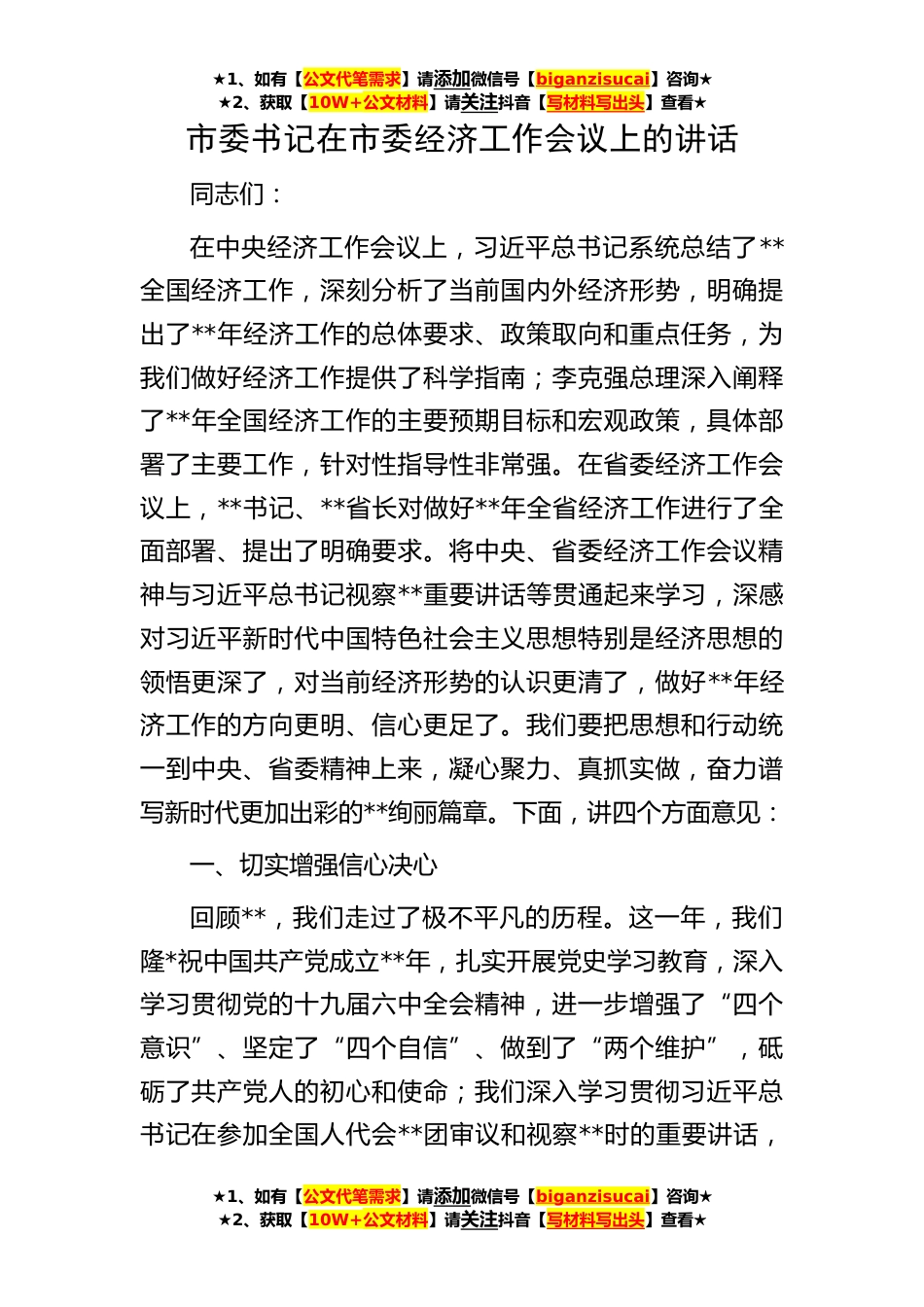 ★1、如有【公文代笔需求】请添加微信号【biganzisucai】咨询★★2、获取【10W+公文材料】请关注抖音【写材料写出头】查看★市委书记在市委经济工作会议上的讲话同志们:在中央经济工作会议上,习近平总书记系统总结了**全国经济工作,深刻分析了当前国内外经济形势,明确提出了**年经济工作的总体要求、政策取向和重点任务,为我们做好经济工作提供了科学指南;李克强总理深入阐释了**年全国经济工作的主要预期目标和宏观政策,具体部署了主要工作,针对性指导性非常强。在省委经济工作会议上,**书记、**省长对做好**年全省经济工作进行了全面部署、提出了明确要求。将中央、省委经济工作会议精神与习近平总书记视察**重要讲话等贯通起来学习,深感对习近平新时代中国特色社会主义思想特别是经济思想的领悟更深...