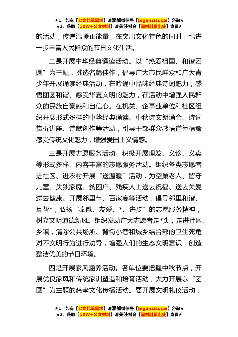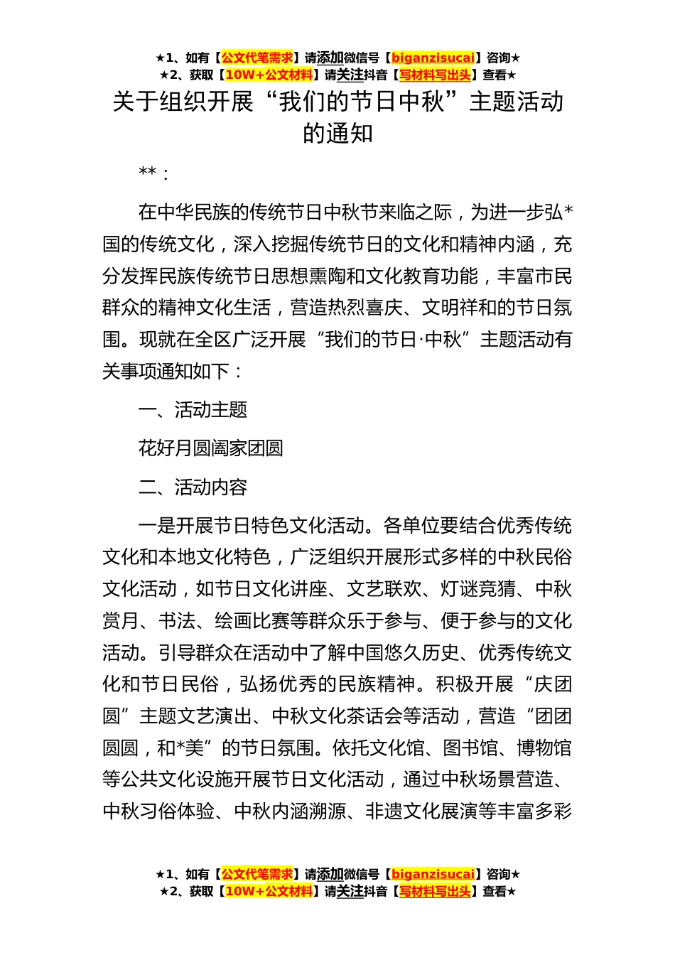 ★1、如有【公文代笔需求】请添加微信号【biganzisucai】咨询★★2、获取【10W+公文材料】请关注抖音【写材料写出头】查看★关于组织开展“我们的节日中秋”主题活动的通知**:在中华民族的传统节日中秋节来临之际,为进一步弘*国的传统文化,深入挖掘传统节日的文化和精神内涵,充分发挥民族传统节日思想熏陶和文化教育功能,丰富市民群众的精神文化生活,营造热烈喜庆、文明祥和的节日氛围。现就在全区广泛开展“我们的节日·中秋”主题活动有关事项通知如下:一、活动主题花好月圆阖家团圆二、活动内容一是开展节日特色文化活动。各单位要结合优秀传统文化和本地文化特色,广泛组织开展形式多样的中秋民俗文化活动,如节日文化讲座、文艺联欢、灯谜竞猜、中秋赏月、书法、绘画比赛等群众乐于参与、便于参与的文...