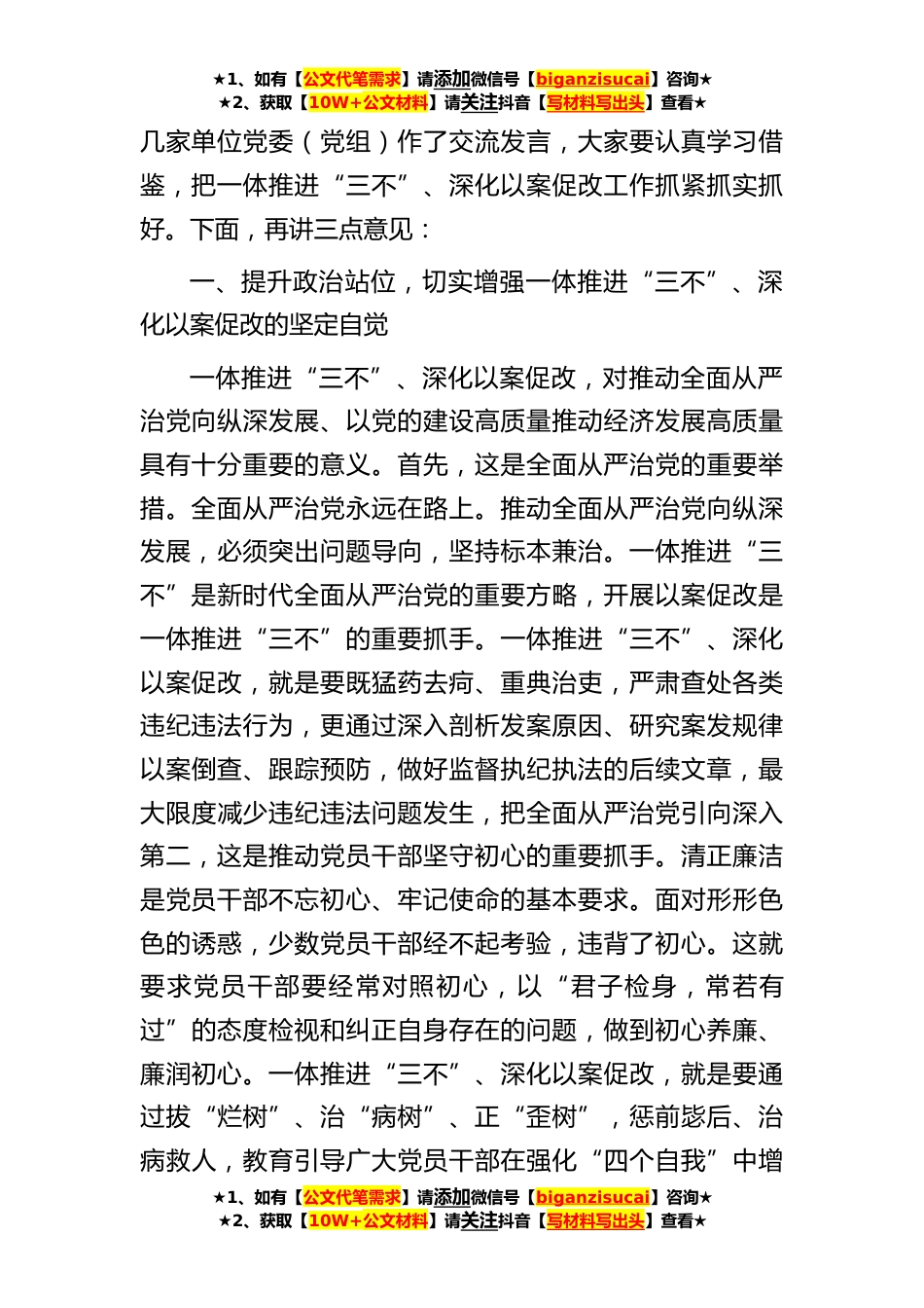★1、如有【公文代笔需求】请添加微信号【biganzisucai】咨询★★2、获取【10W+公文材料】请关注抖音【写材料写出头】查看★市委书记在全市一体推进不敢腐不能腐不想腐深化以案促改工作会议上的讲话同志们:今天我们召开这次会议,一来是深入贯彻习近平总书记关于全面从严治党的重要论述,认真落实全省一体推进不敢腐不能腐不想腐、深化以案促改工作会议精神,对全市一体推进“三不”、深化以案促改工作进行部署,强化制度措施、深化标本兼治,把“严”的主基调长期坚持下去,推动全面从严治党向纵深发展,持续营造风清气正的良好政治生态;二来是对党员干部进行廉政谈话、警示教育,以身边事教育身边人,在关键节点“咬耳朵”“扯袖子”,让广大党员干部从违纪违法案件中进一步认清贪欲之害,引以为戒、警钟长鸣...