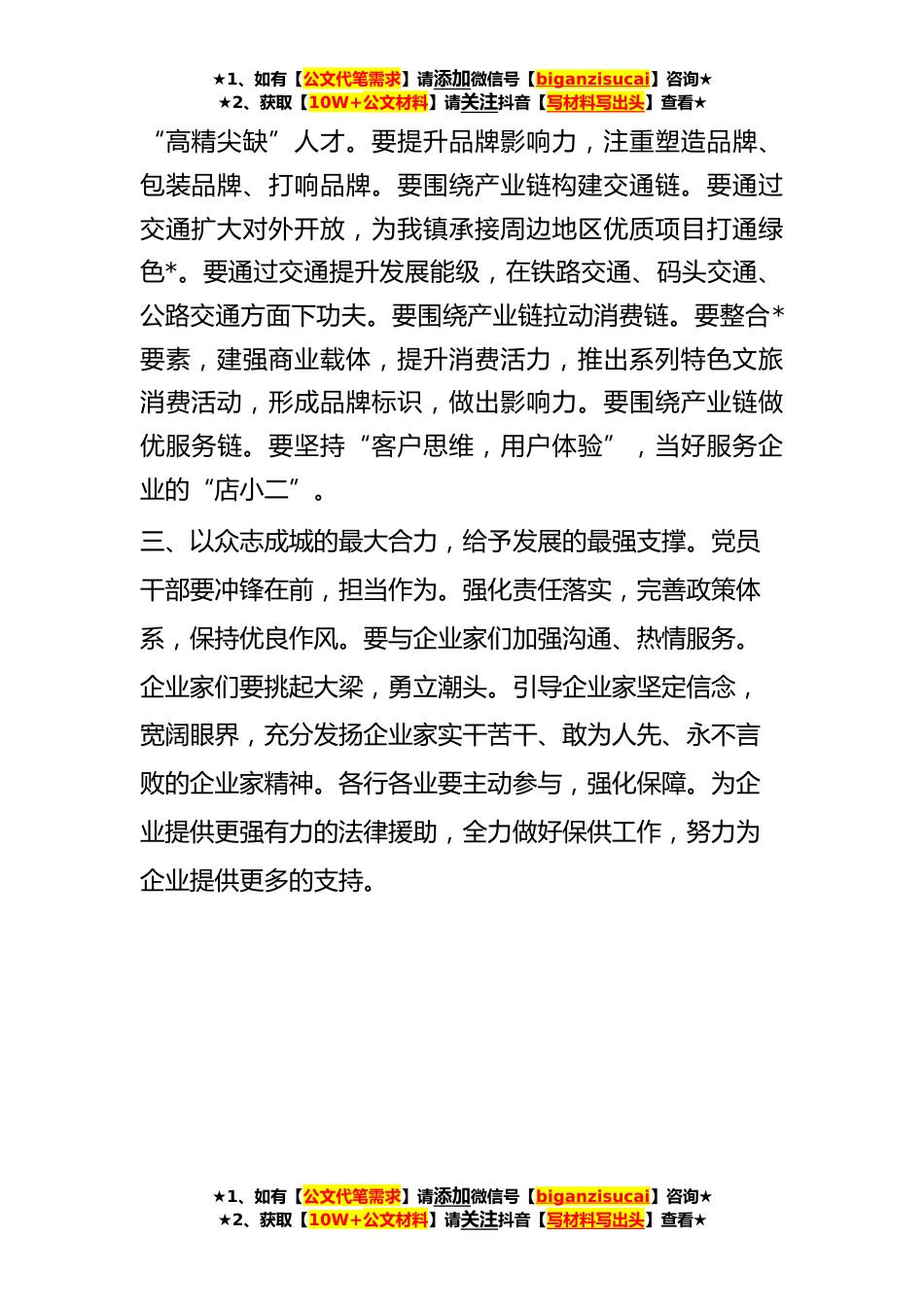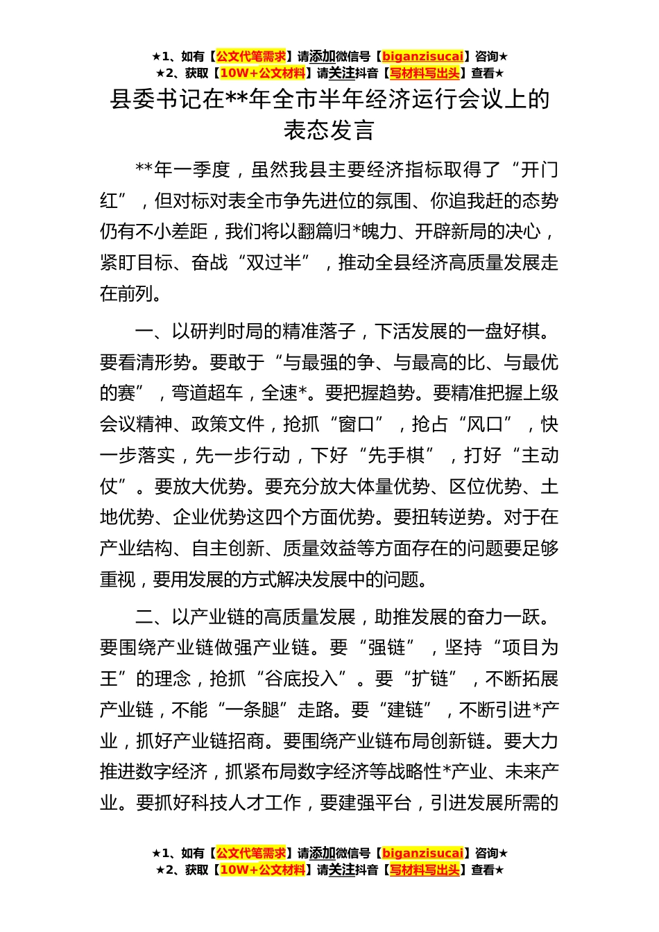 ★1、如有【公文代笔需求】请添加微信号【biganzisucai】咨询★★2、获取【10W+公文材料】请关注抖音【写材料写出头】查看★县委书记在**年全市半年经济运行会议上的表态发言**年一季度,虽然我县主要经济指标取得了“开门红”,但对标对表全市争先进位的氛围、你追我赶的态势仍有不小差距,我们将以翻篇归*魄力、开辟新局的决心,紧盯目标、奋战“双过半”,推动全县经济高质量发展走在前列。一、以研判时局的精准落子,下活发展的一盘好棋。要看清形势。要敢于“与最强的争、与最高的比、与最优的赛”,弯道超车,全速*。要把握趋势。要精准把握上级会议精神、政策文件,抢抓“窗口”,抢占“风口”,快一步落实,先一步行动,下好“先手棋”,打好“主动仗”。要放大优势。要充分放大体量优势、区位优势、土地...