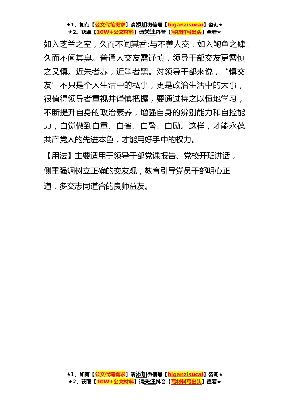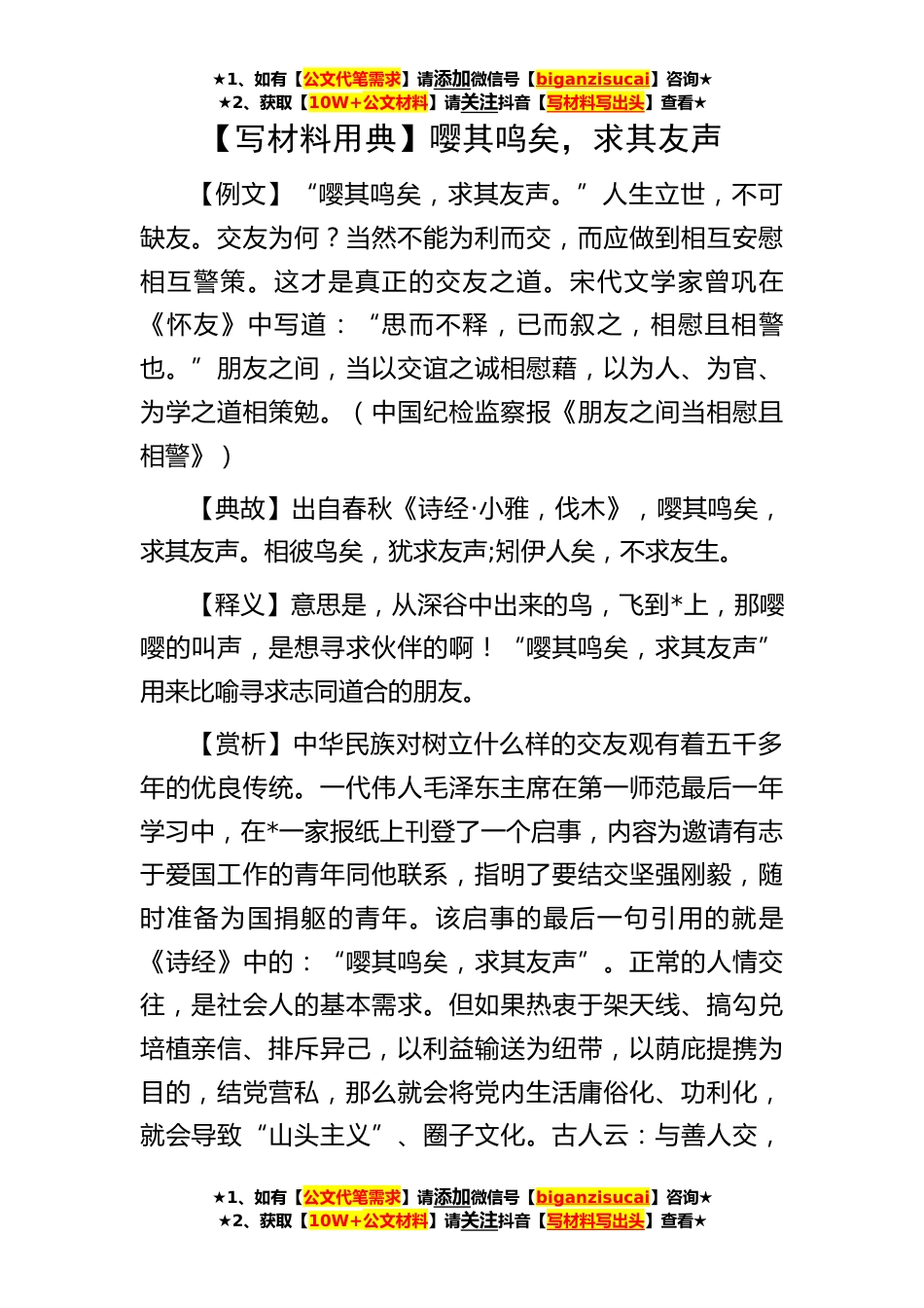 ★1、如有【公文代笔需求】请添加微信号【biganzisucai】咨询★★2、获取【10W+公文材料】请关注抖音【写材料写出头】查看★【写材料用典】嘤其鸣矣,求其友声【例文】“嘤其鸣矣,求其友声。”人生立世,不可缺友。交友为何?当然不能为利而交,而应做到相互安慰相互警策。这才是真正的交友之道。宋代文学家曾巩在《怀友》中写道:“思而不释,已而叙之,相慰且相警也。”朋友之间,当以交谊之诚相慰藉,以为人、为官、为学之道相策勉。(中国纪检监察报《朋友之间当相慰且相警》)【典故】出自春秋《诗经·小雅,伐木》,嘤其鸣矣,求其友声。相彼鸟矣,犹求友声;矧伊人矣,不求友生。【释义】意思是,从深谷中出来的鸟,飞到*上,那嘤嘤的叫声,是想寻求伙伴的啊!“嘤其鸣矣,求其友声”用来比喻寻求志同道合...