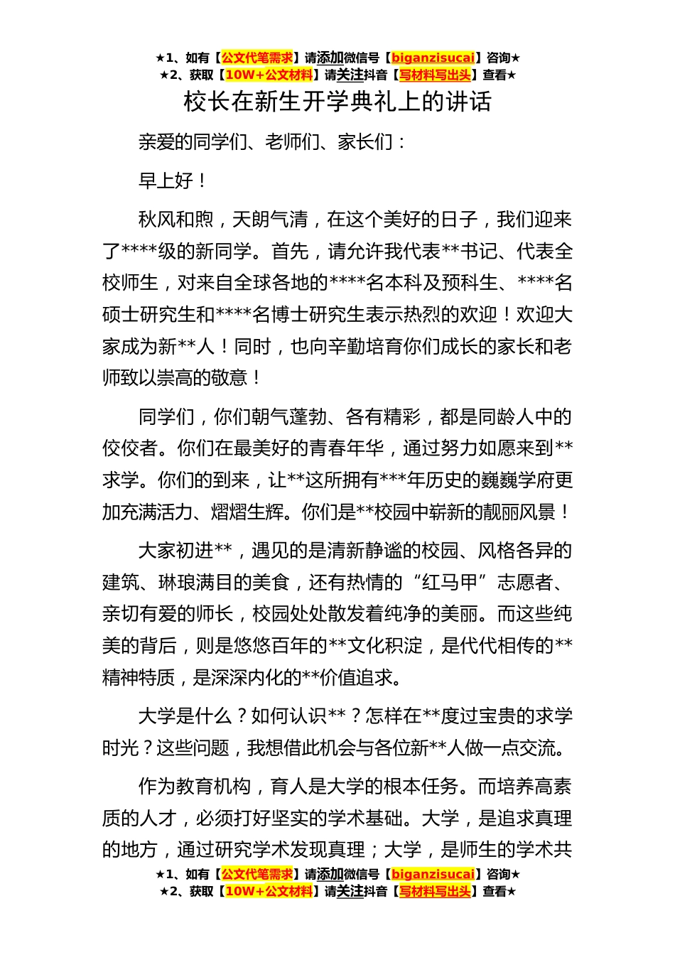 ★1、如有【公文代笔需求】请添加微信号【biganzisucai】咨询★★2、获取【10W+公文材料】请关注抖音【写材料写出头】查看★校长在新生开学典礼上的讲话亲爱的同学们、老师们、家长们:早上好!秋风和煦,天朗气清,在这个美好的日子,我们迎来了****级的新同学。首先,请允许我代表**书记、代表全校师生,对来自全球各地的****名本科及预科生、****名硕士研究生和****名博士研究生表示热烈的欢迎!欢迎大家成为新**人!同时,也向辛勤培育你们成长的家长和老师致以崇高的敬意!同学们,你们朝气蓬勃、各有精彩,都是同龄人中的佼佼者。你们在最美好的青春年华,通过努力如愿来到**求学。你们的到来,让**这所拥有***年历史的巍巍学府更加充满活力、熠熠生辉。你们是**校园中崭新的靓丽风景!大家初进**,遇见的是...