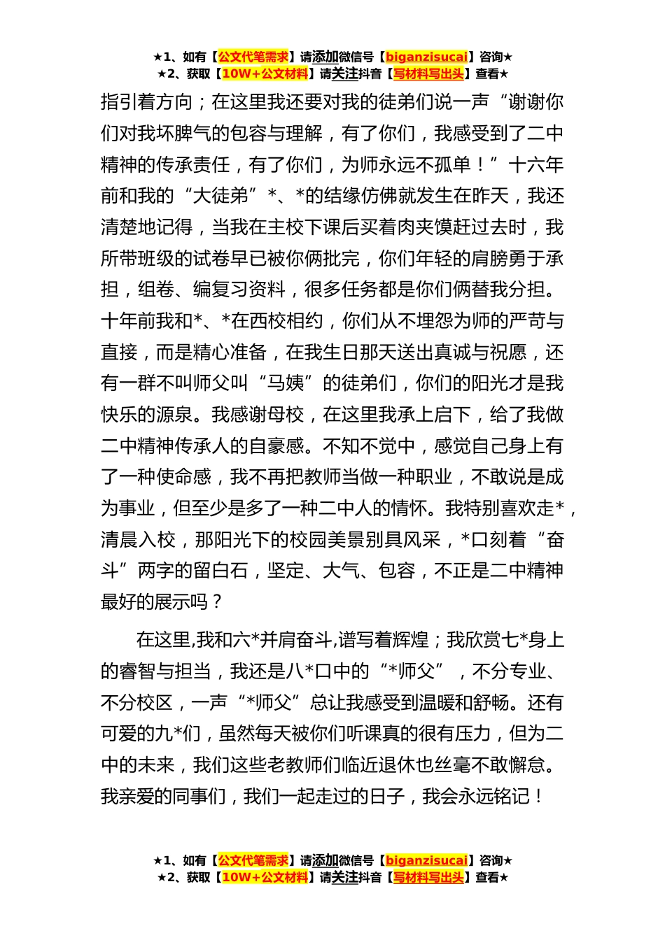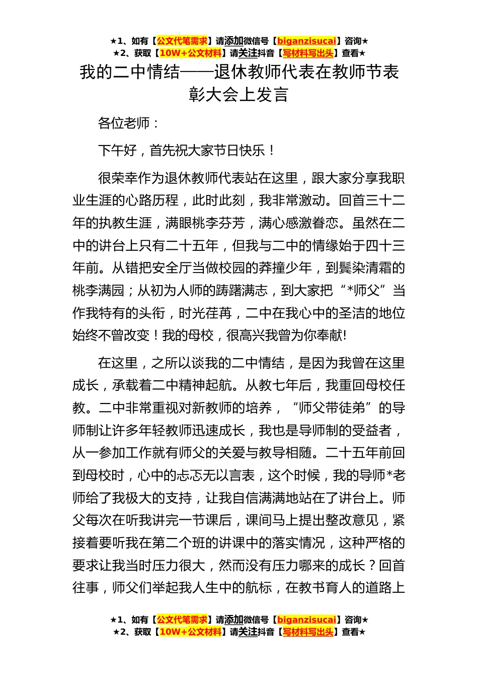 ★1、如有【公文代笔需求】请添加微信号【biganzisucai】咨询★★2、获取【10W+公文材料】请关注抖音【写材料写出头】查看★我的二中情结——退休教师代表在教师节表彰大会上发言各位老师:下午好,首先祝大家节日快乐!很荣幸作为退休教师代表站在这里,跟大家分享我职业生涯的心路历程,此时此刻,我非常激动。回首三十二年的执教生涯,满眼桃李芬芳,满心感激眷恋。虽然在二中的讲台上只有二十五年,但我与二中的情缘始于四十三年前。从错把安全厅当做校园的莽撞少年,到鬓染清霜的桃李满园;从初为人师的踌躇满志,到大家把“*师父”当作我特有的头衔,时光荏苒,二中在我心中的圣洁的地位始终不曾改变!我的母校,很高兴我曾为你奉献!在这里,之所以谈我的二中情结,是因为我曾在这里成长,承载着二中精神起...