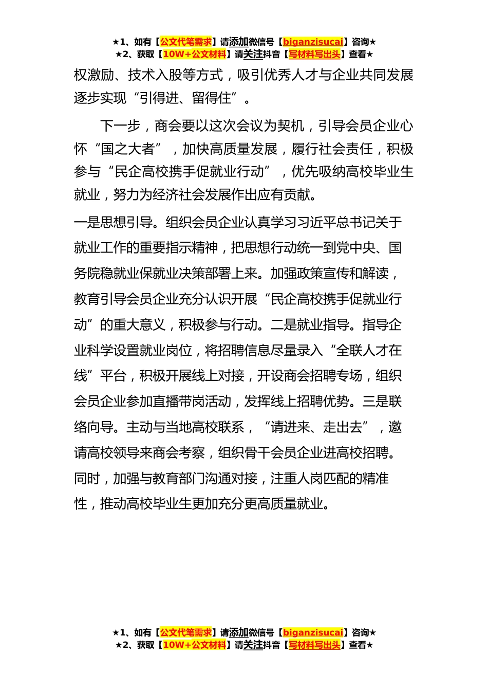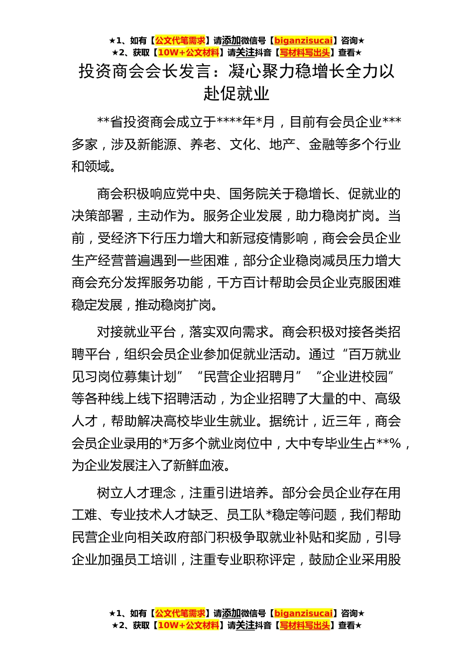 ★1、如有【公文代笔需求】请添加微信号【biganzisucai】咨询★★2、获取【10W+公文材料】请关注抖音【写材料写出头】查看★投资商会会长发言:凝心聚力稳增长全力以赴促就业**省投资商会成立于****年*月,目前有会员企业***多家,涉及新能源、养老、文化、地产、金融等多个行业和领域。商会积极响应党中央、国务院关于稳增长、促就业的决策部署,主动作为。服务企业发展,助力稳岗扩岗。当前,受经济下行压力增大和新冠疫情影响,商会会员企业生产经营普遍遇到一些困难,部分企业稳岗减员压力增大商会充分发挥服务功能,千方百计帮助会员企业克服困难稳定发展,推动稳岗扩岗。对接就业平台,落实双向需求。商会积极对接各类招聘平台,组织会员企业参加促就业活动。通过“百万就业见习岗位募集计划”“民营企业招...