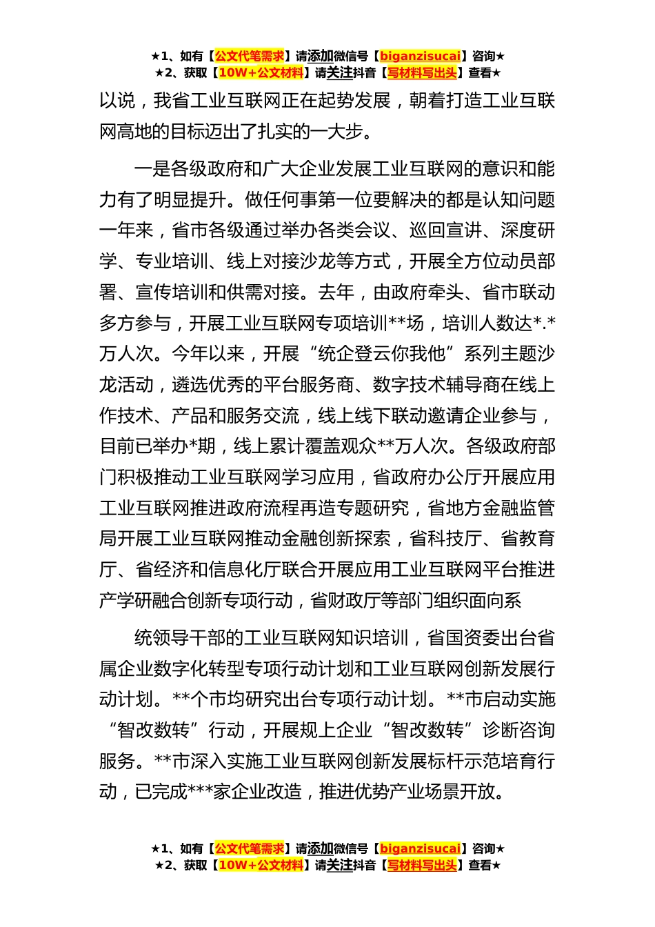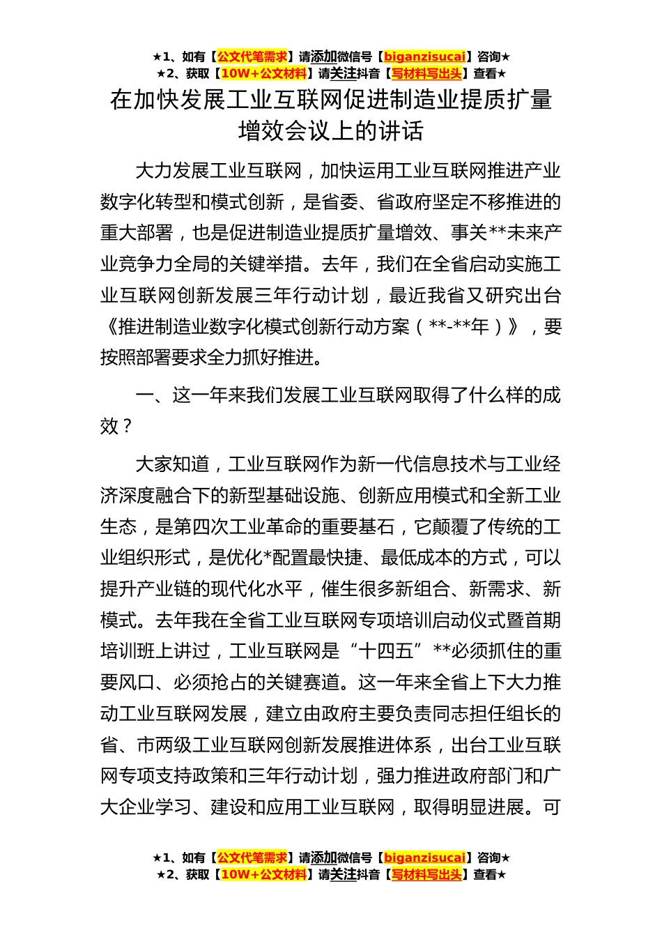★1、如有【公文代笔需求】请添加微信号【biganzisucai】咨询★★2、获取【10W+公文材料】请关注抖音【写材料写出头】查看★在加快发展工业互联网促进制造业提质扩量增效会议上的讲话大力发展工业互联网,加快运用工业互联网推进产业数字化转型和模式创新,是省委、省政府坚定不移推进的重大部署,也是促进制造业提质扩量增效、事关**未来产业竞争力全局的关键举措。去年,我们在全省启动实施工业互联网创新发展三年行动计划,最近我省又研究出台《推进制造业数字化模式创新行动方案(**-**年)》,要按照部署要求全力抓好推进。一、这一年来我们发展工业互联网取得了什么样的成效?大家知道,工业互联网作为新一代信息技术与工业经济深度融合下的新型基础设施、创新应用模式和全新工业生态,是第四次工业革命的重...