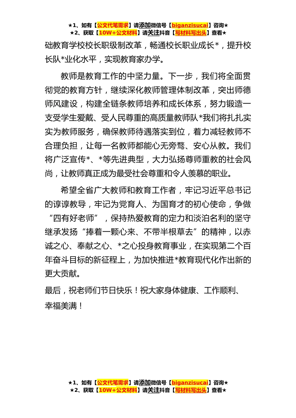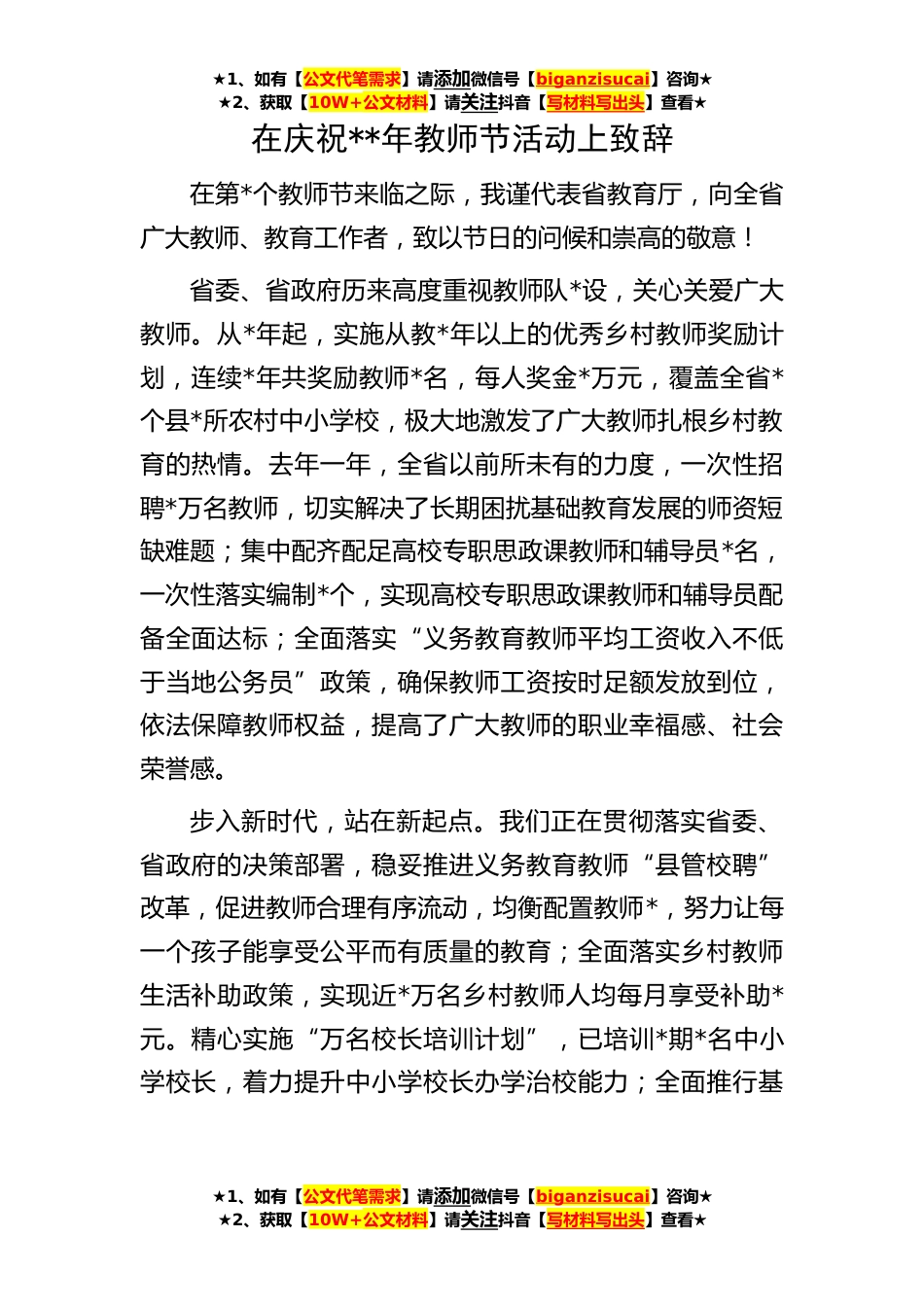 ★1、如有【公文代笔需求】请添加微信号【biganzisucai】咨询★★2、获取【10W+公文材料】请关注抖音【写材料写出头】查看★在庆祝**年教师节活动上致辞在第*个教师节来临之际,我谨代表省教育厅,向全省广大教师、教育工作者,致以节日的问候和崇高的敬意!省委、省政府历来高度重视教师队*设,关心关爱广大教师。从*年起,实施从教*年以上的优秀乡村教师奖励计划,连续*年共奖励教师*名,每人奖金*万元,覆盖全省*个县*所农村中小学校,极大地激发了广大教师扎根乡村教育的热情。去年一年,全省以前所未有的力度,一次性招聘*万名教师,切实解决了长期困扰基础教育发展的师资短缺难题;集中配齐配足高校专职思政课教师和辅导员*名,一次性落实编制*个,实现高校专职思政课教师和辅导员配备全面达标;全面落实“...
