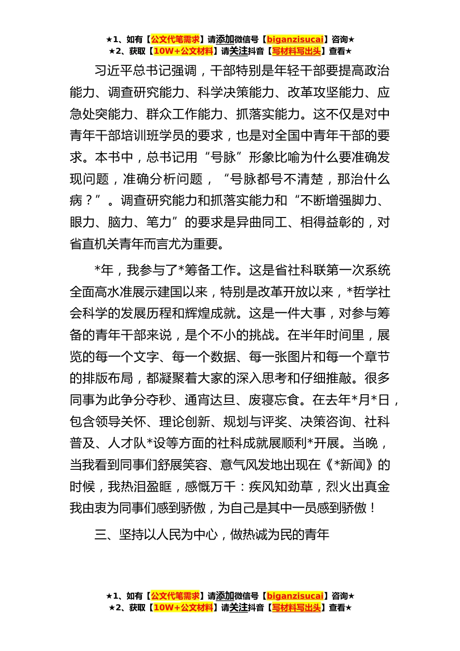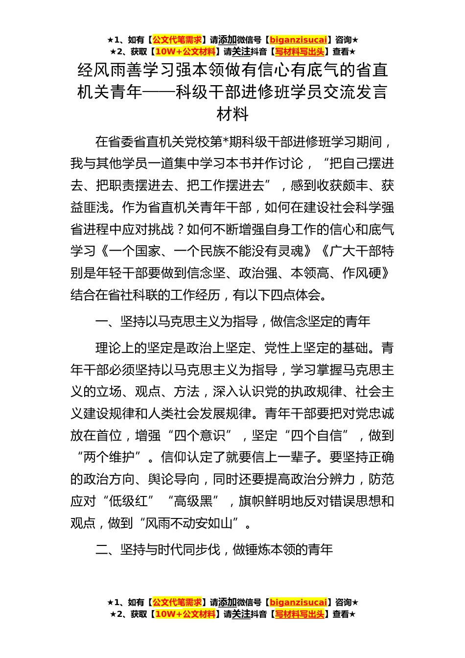 ★1、如有【公文代笔需求】请添加微信号【biganzisucai】咨询★★2、获取【10W+公文材料】请关注抖音【写材料写出头】查看★经风雨善学习强本领做有信心有底气的省直机关青年——科级干部进修班学员交流发言材料在省委省直机关党校第*期科级干部进修班学习期间,我与其他学员一道集中学习本书并作讨论,“把自己摆进去、把职责摆进去、把工作摆进去”,感到收获颇丰、获益匪浅。作为省直机关青年干部,如何在建设社会科学强省进程中应对挑战?如何不断增强自身工作的信心和底气学习《一个国家、一个民族不能没有灵魂》《广大干部特别是年轻干部要做到信念坚、政治强、本领高、作风硬》结合在省社科联的工作经历,有以下四点体会。一、坚持以马克思主义为指导,做信念坚定的青年理论上的坚定是政治上坚定、党性上坚...