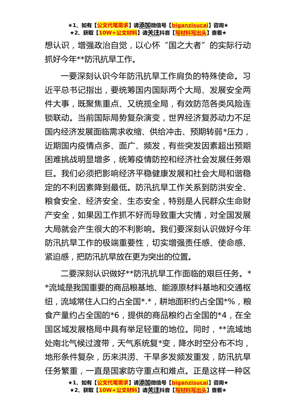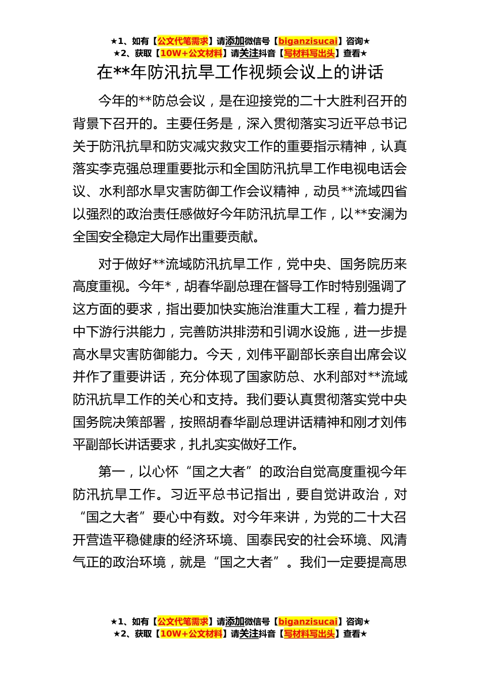 ★1、如有【公文代笔需求】请添加微信号【biganzisucai】咨询★★2、获取【10W+公文材料】请关注抖音【写材料写出头】查看★在**年防汛抗旱工作视频会议上的讲话今年的**防总会议,是在迎接党的二十大胜利召开的背景下召开的。主要任务是,深入贯彻落实习近平总书记关于防汛抗旱和防灾减灾救灾工作的重要指示精神,认真落实李克强总理重要批示和全国防汛抗旱工作电视电话会议、水利部水旱灾害防御工作会议精神,动员**流域四省以强烈的政治责任感做好今年防汛抗旱工作,以**安澜为全国安全稳定大局作出重要贡献。对于做好**流域防汛抗旱工作,党中央、国务院历来高度重视。今年*,胡春华副总理在督导工作时特别强调了这方面的要求,指出要加快实施治淮重大工程,着力提升中下游行洪能力,完善防洪排涝和引调水设施...