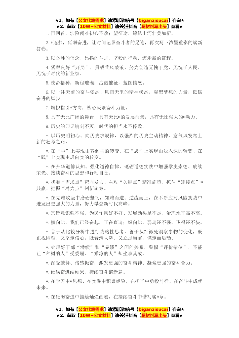 ★1、如有【公文代笔需求】请添加微信号【biganzisucai】咨询★★2、获取【10W+公文材料】请关注抖音【写材料写出头】查看★1.再回首,涉险闯难初心不改;望征途,锦绣山河壮美如新。2.*逐梦,砥砺奋进,让时间记录奋斗者的足迹,再次写下浓墨重彩的崭新答卷。3.以必胜的信念、昂扬的斗志、坚毅的行动,迈步新的征程。4.紧跟良好“开局”,勇毅乘风破浪,努力创造无愧于党、无愧于人民、无愧于时代的新业绩。5.使命播种,新程璀璨;战鼓催征,蓝图铺展。6.以一往无前的奋斗姿态、风雨无阻的精神状态,凝聚梦想的力量,砥砺奋进的脚步。7.旗帜指引*方向,核心凝聚奋斗力量。8.具有无比广阔的舞台,具有无比*的发展前景,具有无比强大的*动力。9.历史的印记镌刻不灭,时代的担当永不停歇。*.以历史明初心、向历史求...