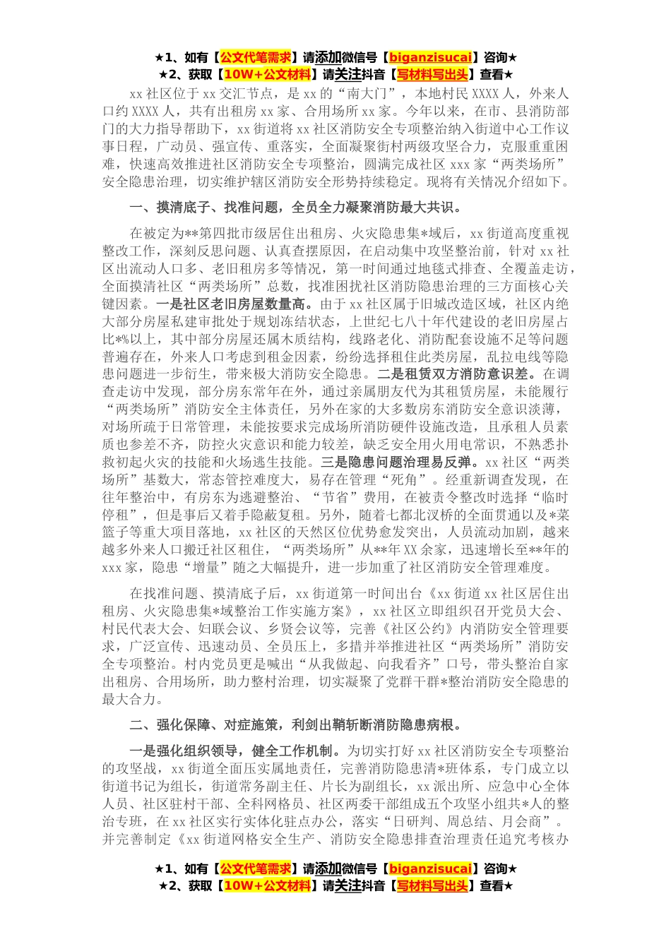 ★1、如有【公文代笔需求】请添加微信号【biganzisucai】咨询★★2、获取【10W+公文材料】请关注抖音【写材料写出头】查看★xx社区位于xx交汇节点,是xx的“南大门”,本地村民XXXX人,外来人口约XXXX人,共有出租房xx家、合用场所xx家。今年以来,在市、县消防部门的大力指导帮助下,xx街道将xx社区消防安全专项整治纳入街道中心工作议事日程,广动员、强宣传、重落实,全面凝聚街村两级攻坚合力,克服重重困难,快速高效推进社区消防安全专项整治,圆满完成社区xxx家“两类场所”安全隐患治理,切实维护辖区消防安全形势持续稳定。现将有关情况介绍如下。一、摸清底子、找准问题,全员全力凝聚消防最大共识。在被定为**第四批市级居住出租房、火灾隐患集*域后,xx街道高度重视整改工作,深刻反思问题、认真查摆...