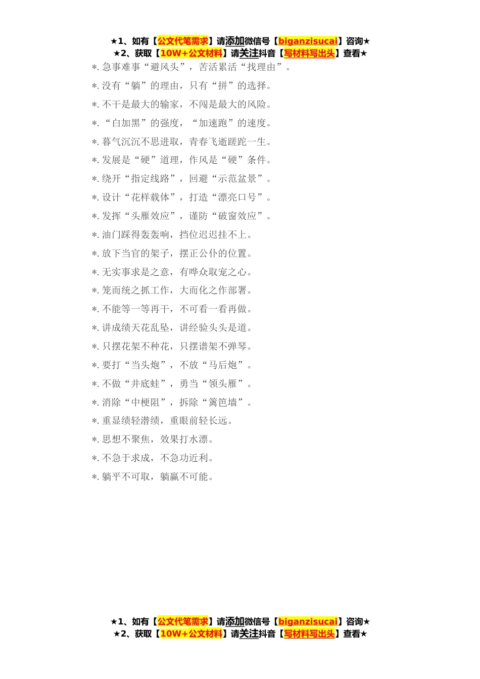 ★1、如有【公文代笔需求】请添加微信号【biganzisucai】咨询★★2、获取【10W+公文材料】请关注抖音【写材料写出头】查看★1.杜绝一切贪图安逸、不愿继续艰苦奋斗的想法,摒弃一切骄傲自满、不愿继续开拓*的情绪。2.摒弃“工作分好坏、干事论大小”的思维,破除“脚不沾泥、有求无应”的做派。3.多些“工匠精神”,少些“干货思维”;多些“慢工细活”,少些“囫囵吞枣”。4.多搞“精准滴灌”、少搞“大水漫灌”,多点“弱项补差”、少点“面面俱到”。5.看重眼前一时一刻突击的“显绩”,忽视平时一步一个脚印的“潜功”。6.多些攻坚克难、攻城拔寨的勇气,少些畏首畏尾、患得患失的顾虑。7.惯于在求稳怕乱中“明哲保身”,生怕在撑腰解困中“引火烧身”。8.变“大水漫灌”为“精准滴灌”,变“粗放经营”为“精...