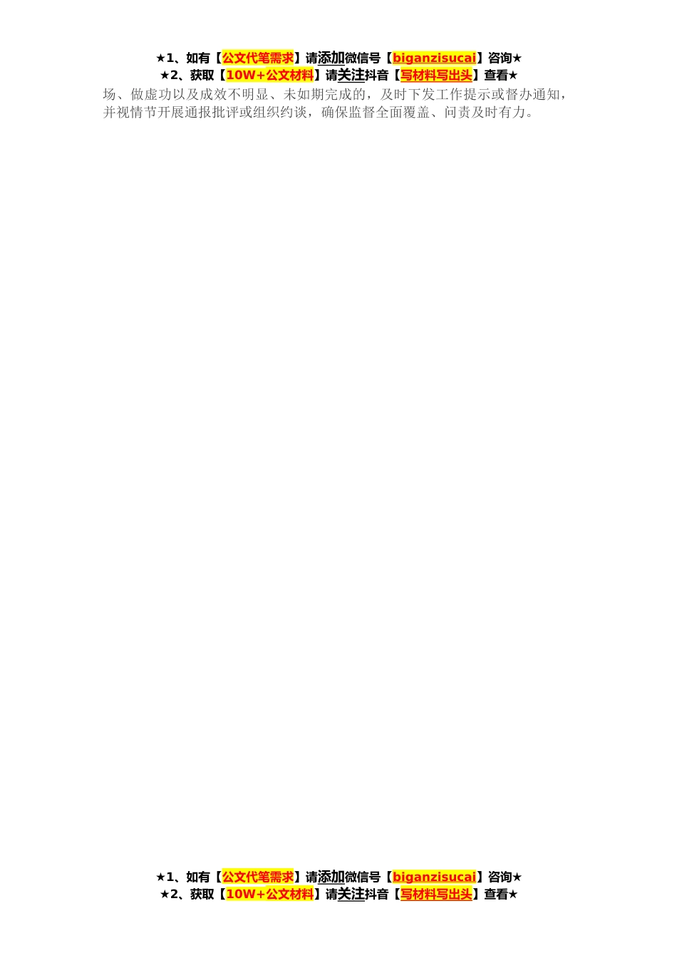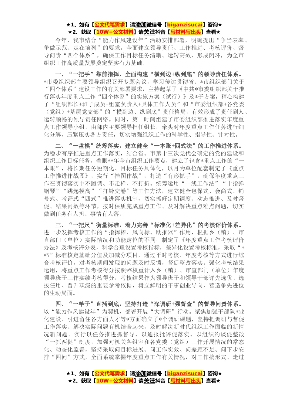 ★1、如有【公文代笔需求】请添加微信号【biganzisucai】咨询★★2、获取【10W+公文材料】请关注抖音【写材料写出头】查看★今年,我市结合“能力作风建设年”活动安排部署,明确提出“争当表率、争做示范、走在前列”的要求,全面建立领导责任、工作推进、考核评价、督导问责“四个体系”,确保工作目标任务清晰、运转高效、形成闭环,为全市组织工作高质量发展奠定坚实有力基础。一、“一把手”靠前指挥,全面构建“横到边+纵到底”的领导责任体系。*市委组织部主要领导组织召开专题会议,学习传达贯彻省、*市组织部门关于“四个体系”建设工作的有关部署要求,主持起草了《中共*市委组织部关于推行落实年度重点工作“四个体系”的实施方案(试行)》及*子方案,精心构建了“组织部长+班子成员+组室负责人+具体...