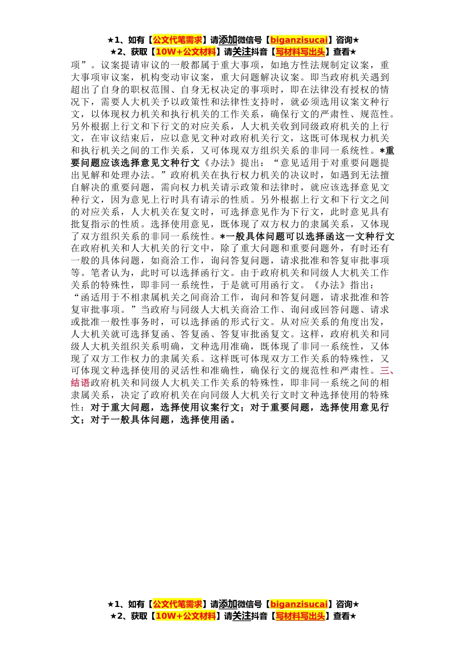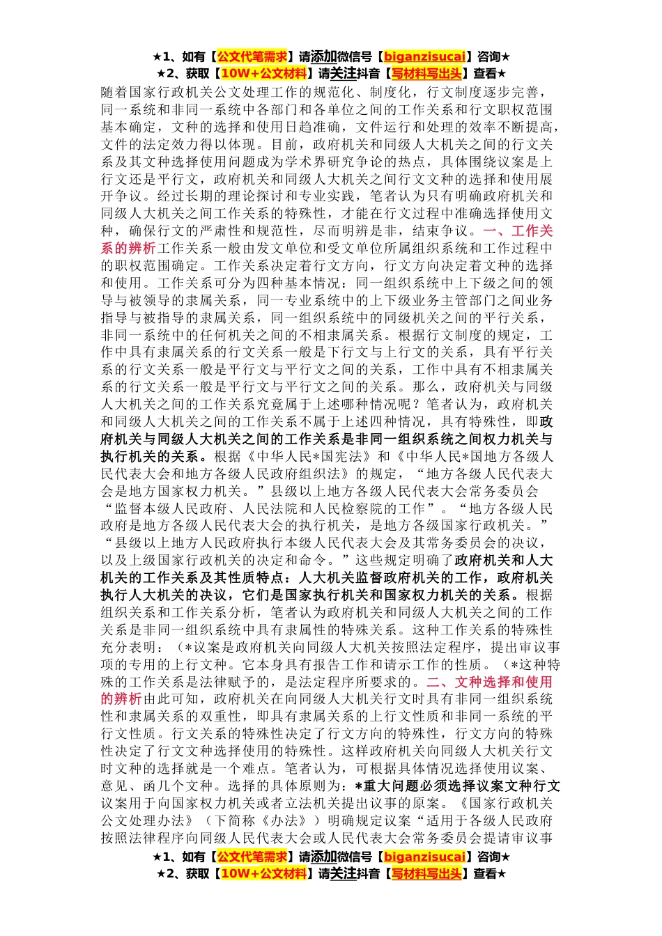 ★1、如有【公文代笔需求】请添加微信号【biganzisucai】咨询★★2、获取【10W+公文材料】请关注抖音【写材料写出头】查看★随着国家行政机关公文处理工作的规范化、制度化,行文制度逐步完善,同一系统和非同一系统中各部门和各单位之间的工作关系和行文职权范围基本确定,文种的选择和使用日趋准确,文件运行和处理的效率不断提高,文件的法定效力得以体现。目前,政府机关和同级人大机关之间的行文关系及其文种选择使用问题成为学术界研究争论的热点,具体围绕议案是上行文还是平行文,政府机关和同级人大机关之间行文文种的选择和使用展开争议。经过长期的理论探讨和专业实践,笔者认为只有明确政府机关和同级人大机关之间工作关系的特殊性,才能在行文过程中准确选择使用文种,确保行文的严肃性和规范性,尽...