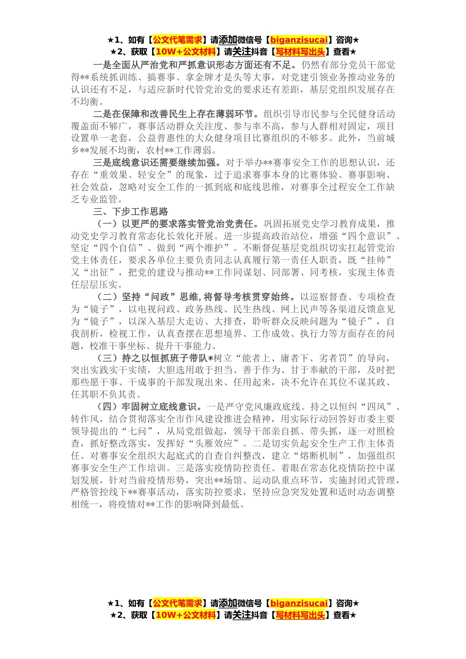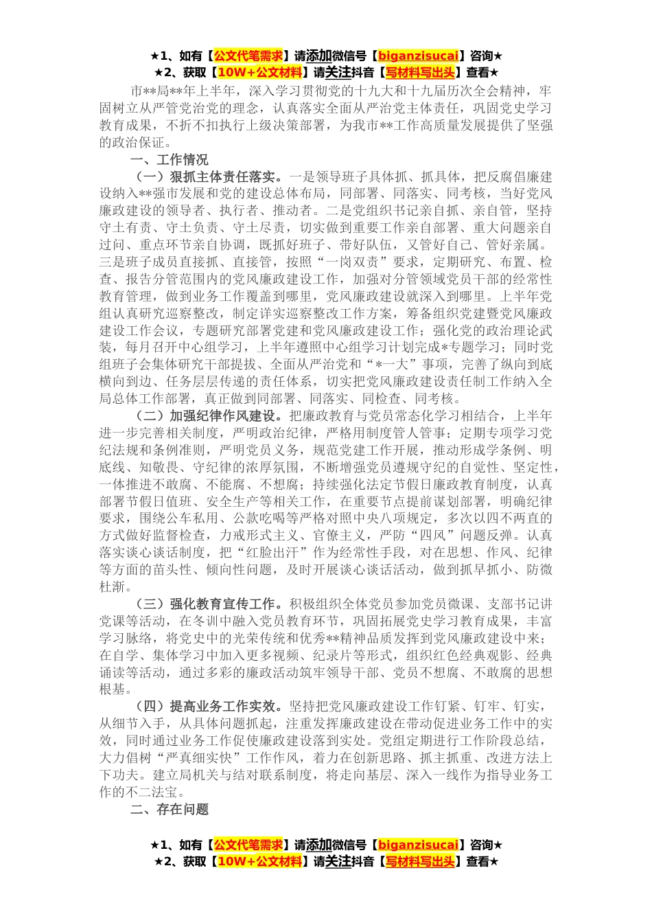 ★1、如有【公文代笔需求】请添加微信号【biganzisucai】咨询★★2、获取【10W+公文材料】请关注抖音【写材料写出头】查看★市**局**年上半年,深入学习贯彻党的十九大和十九届历次全会精神,牢固树立从严管党治党的理念,认真落实全面从严治党主体责任,巩固党史学习教育成果,不折不扣执行上级决策部署,为我市**工作高质量发展提供了坚强的政治保证。一、工作情况(一)狠抓主体责任落实。一是领导班子具体抓、抓具体,把反腐倡廉建设纳入**强市发展和党的建设总体布局,同部署、同落实、同考核,当好党风廉政建设的领导者、执行者、推动者。二是党组织书记亲自抓、亲自管,坚持守土有责、守土负责、守土尽责,切实做到重要工作亲自部署、重大问题亲自过问、重点环节亲自协调,既抓好班子、带好队伍,又管好自...