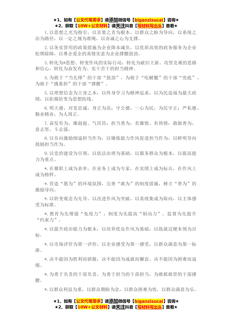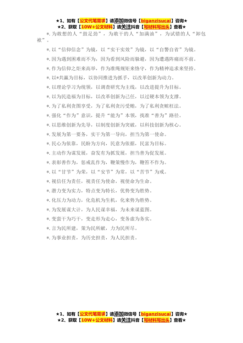 ★1、如有【公文代笔需求】请添加微信号【biganzisucai】咨询★★2、获取【10W+公文材料】请关注抖音【写材料写出头】查看★1.以思想之光为指引,以首要之责为根本,以群众之盼为导向,以系统之治为路径,以一定之规为准绳,以赤诚之心为支撑。2.以务实管用的政策措施为企业降本减负,以优质高效的政务服务为企业松绑除障,以尊企爱企的真情实意为企业撑腰鼓劲。3.转化为*思想、转变作风的实际行动,转化为破旧立新、攻坚克难的思路和信心,转化为奋发有为、实干苦干的担当精神。4.为敢于“当先锋”的干部“鼓劲”,为敢于“吃螃蟹”的干部“兜底”,为敢于“挑重担”的干部“撑腰”。5.以理想信念为立身之本,以终身学习为精神追求,以为民造福为最大政绩,以拒腐防变为思想防线。6.明大德,对党忠诚,身正为范;...