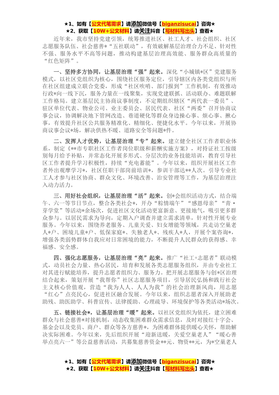 ★1、如有【公文代笔需求】请添加微信号【biganzisucai】咨询★★2、获取【10W+公文材料】请关注抖音【写材料写出头】查看★近年来,我市坚持党建引领,统筹推进社区、社工人才、社会组织、社区志愿服务队伍、社会慈善*“五社联动”,有效破解基层治理合力不足、针对性不强、服务水平不高等问题,推动构建基层治理高效能、服务群众高质量的“红色矩阵”。一、坚持多方协同,让基层治理“强”起来。深化“小城镇*区”党建服务模式,以社区党组织为核心,围绕社区服务定位,引导辖区内各类党组织与所在社区组建成立联合党委,形成“社区吹哨、部门报到”工作机制,有效推动行政*向一线下沉,服务力量在一线聚集,实现党建联抓、活动联办、难题联解工作格局。建立基层民主协商议事制度,不定期组织辖区“两代表一委员...