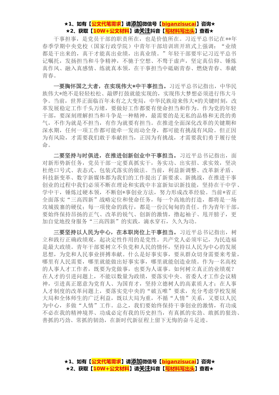 ★1、如有【公文代笔需求】请添加微信号【biganzisucai】咨询★★2、获取【10W+公文材料】请关注抖音【写材料写出头】查看★干事担事,是党员干部的职责所在,也是价值所在。习近平总书记在**年春季学期中央党校(国家行政学院)中青年干部培训班开班式上强调:“业绩都是干出来的,真干才能真出业绩,出真业绩。”年轻干部要牢记习近平总书记嘱托,发扬担当和斗争精神,不驰于空想、不骛于虚声,坚定真信仰、锤炼真作风、融入真感情、练就真本领,在干事担当中砥砺青春、燃烧青春、奉献青春。一要胸怀国之大者,在实现伟大*中干事担当。习近平总书记指出,中华民族伟大*绝不是轻轻松松、敲锣打鼓就能实现的,实现伟大梦想必须进行伟大斗争。当前,世界正面临百年未有之大变局,中华民族迎来伟大*的关键时刻,改革...