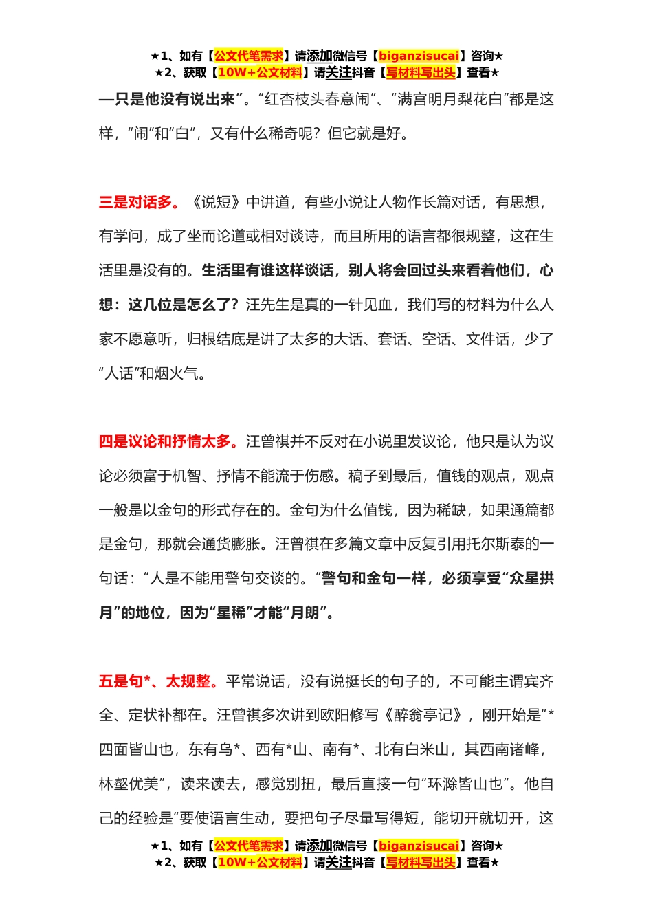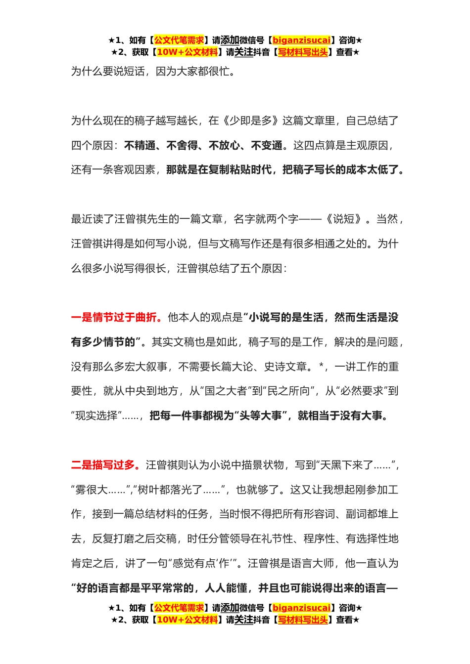 ★1、如有【公文代笔需求】请添加微信号【biganzisucai】咨询★★2、获取【10W+公文材料】请关注抖音【写材料写出头】查看★为什么要说短话,因为大家都很忙。为什么现在的稿子越写越长,在《少即是多》这篇文章里,自己总结了四个原因:不精通、不舍得、不放心、不变通。这四点算是主观原因,还有一条客观因素,那就是在复制粘贴时代,把稿子写长的成本太低了。最近读了汪曾祺先生的一篇文章,名字就两个字——《说短》。当然,汪曾祺讲得是如何写小说,但与文稿写作还是有很多相通之处的。为什么很多小说写得很长,汪曾祺总结了五个原因:一是情节过于曲折。他本人的观点是“小说写的是生活,然而生活是没有多少情节的”。其实文稿也是如此,稿子写的是工作,解决的是问题,没有那么多宏大叙事,不需要长篇大论...