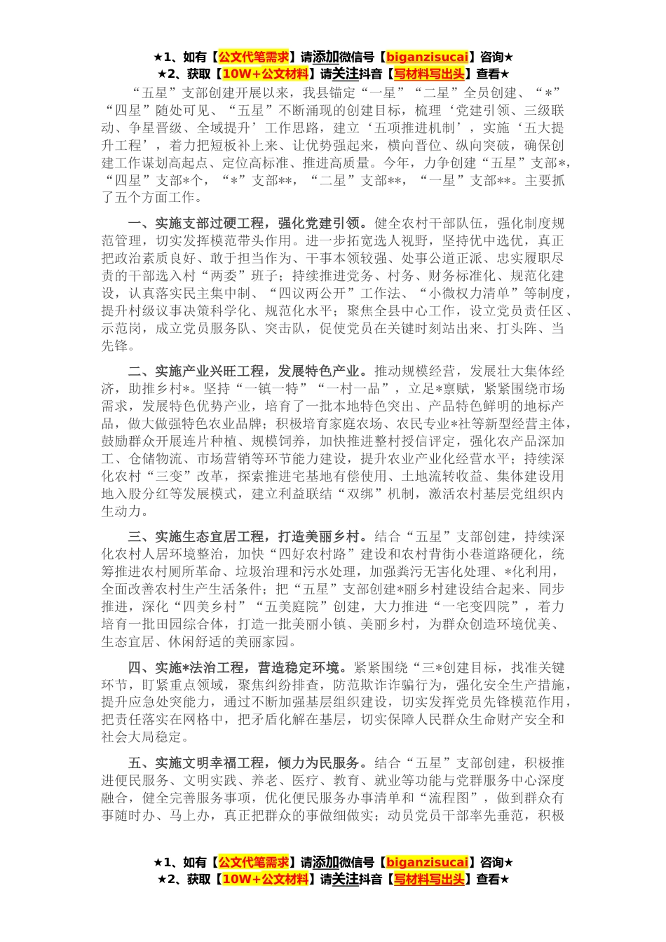 ★1、如有【公文代笔需求】请添加微信号【biganzisucai】咨询★★2、获取【10W+公文材料】请关注抖音【写材料写出头】查看★“五星”支部创建开展以来,我县锚定“一星”“二星”全员创建、“*”“四星”随处可见、“五星”不断涌现的创建目标,梳理‘党建引领、三级联动、争星晋级、全域提升’工作思路,建立‘五项推进机制’,实施‘五大提升工程’,着力把短板补上来、让优势强起来,横向晋位、纵向突破,确保创建工作谋划高起点、定位高标准、推进高质量。今年,力争创建“五星”支部*,“四星”支部*个,“*”支部**,“二星”支部**,“一星”支部**。主要抓了五个方面工作。一、实施支部过硬工程,强化党建引领。健全农村干部队伍,强化制度规范管理,切实发挥模范带头作用。进一步拓宽选人视野,坚持优中...